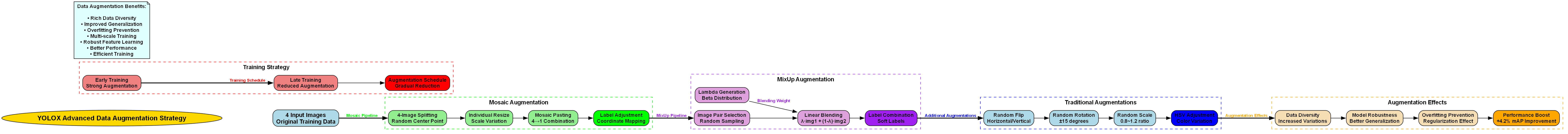 数据增强:采用Mosaic数据增强技术,将4张随机选择的图像拼接成一张新图像,增加了训练数据的多样性。同时应用随机翻转、色彩变换和对比度调整等操作,提高模型的泛化能力。
