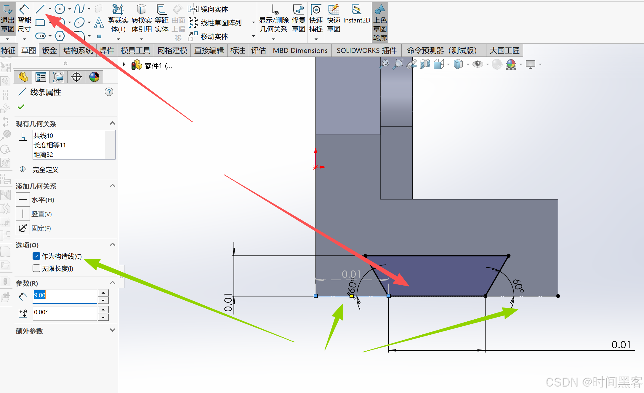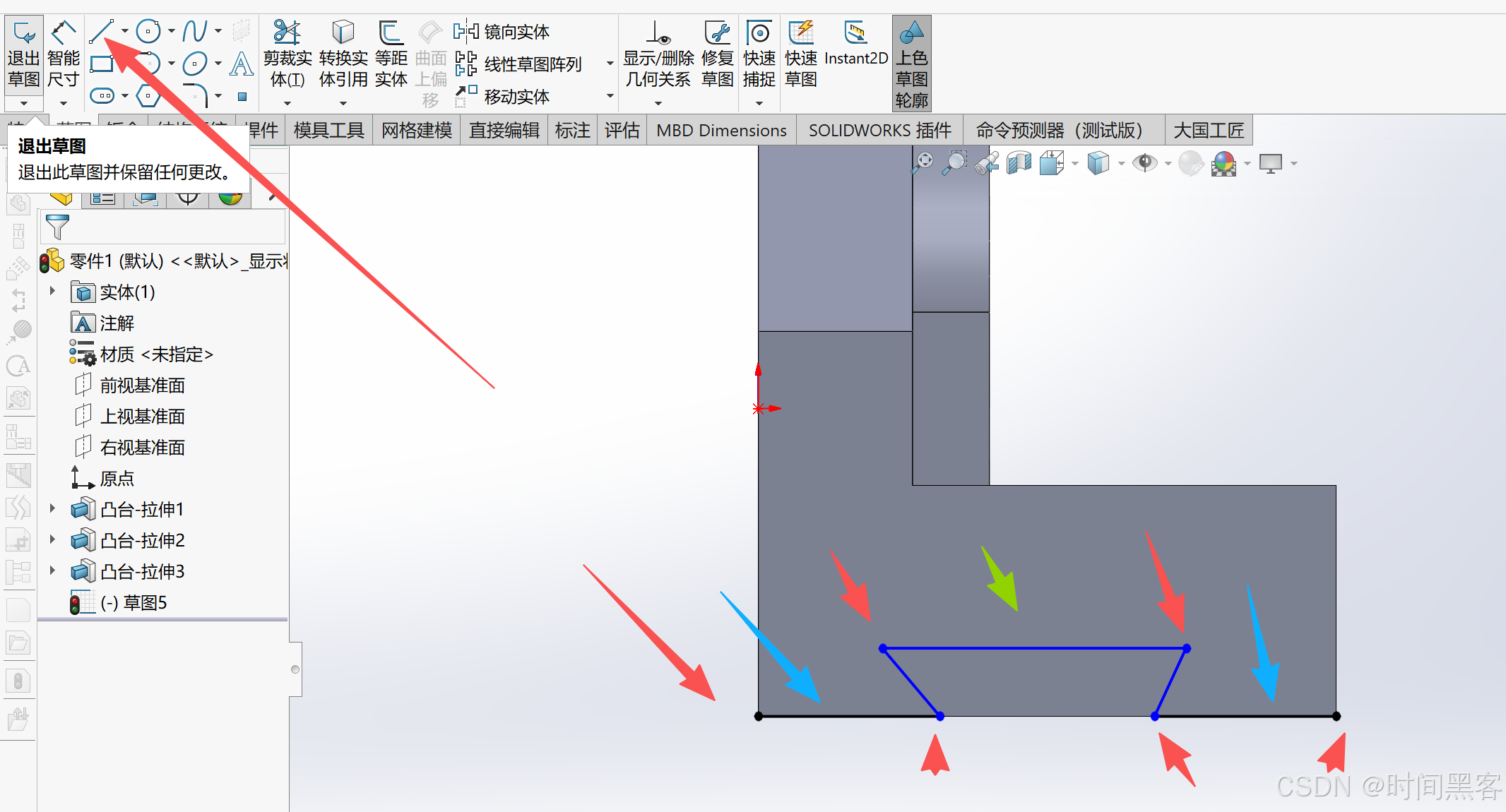 然后侧面绘制草图、接着,两个底下的相等、上面的水平。