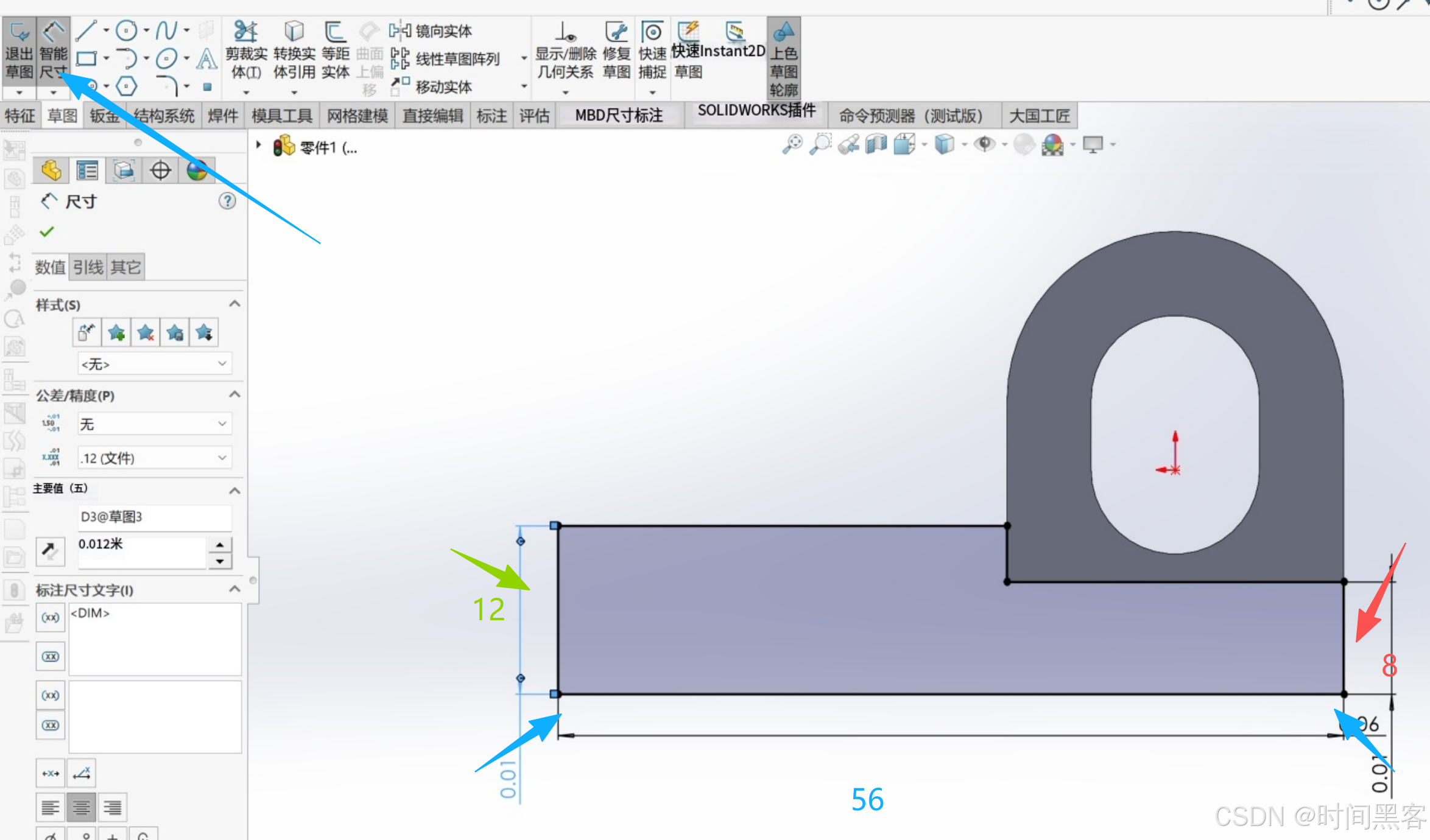 智能尺寸,大高度8、小高度5、小半径6、大半径12.然后加个直线、删除底下大半径。