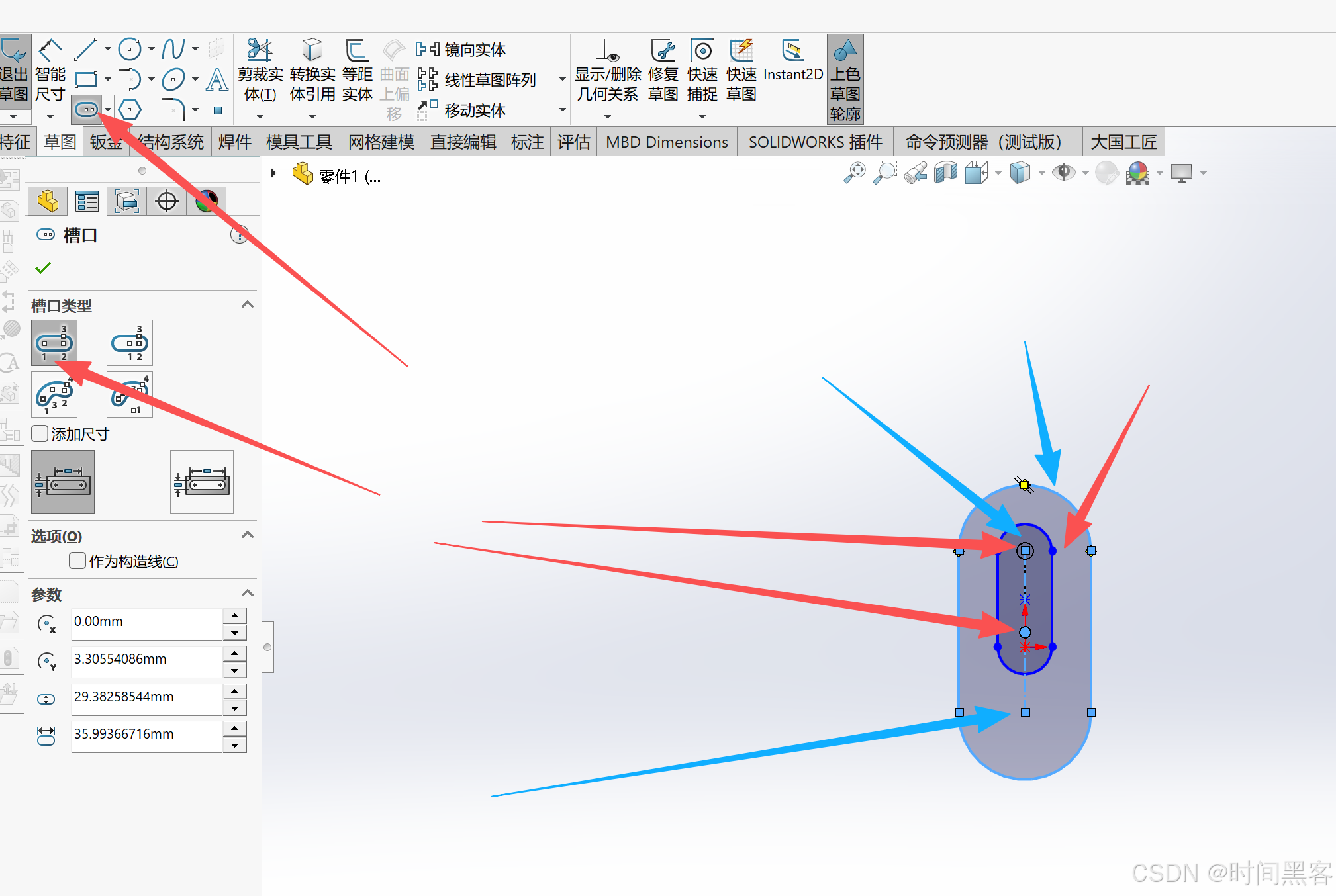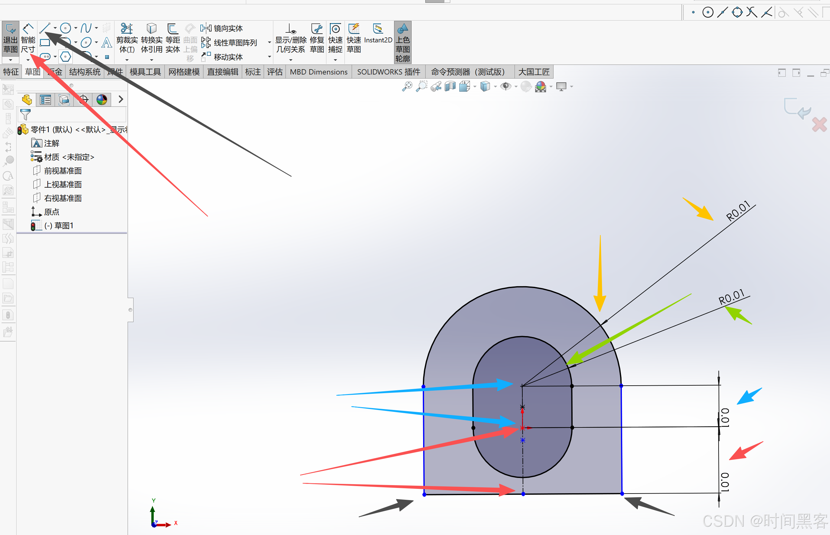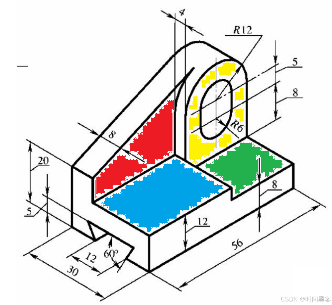 蓝绿部分的总长知道、但是分别的长没有给出,需要红黄部分推断。红部分的一个关系是与黄部分相切(没有交线)。思路是1、黄部分先建立。2、蓝绿部分。3、红色部分再建立。4、底下切槽部分。