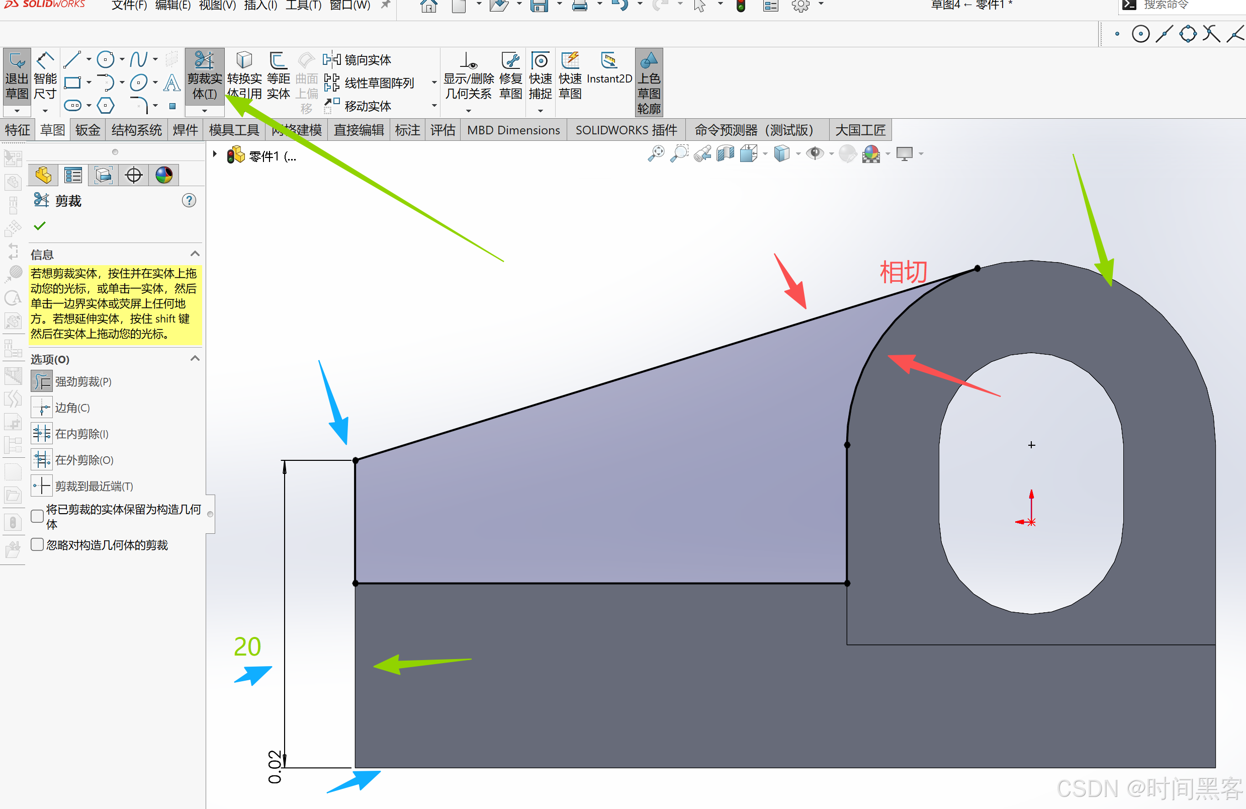 然后选斜线和半圆,相切,接着高点和底线,20,剪裁其他的部分。