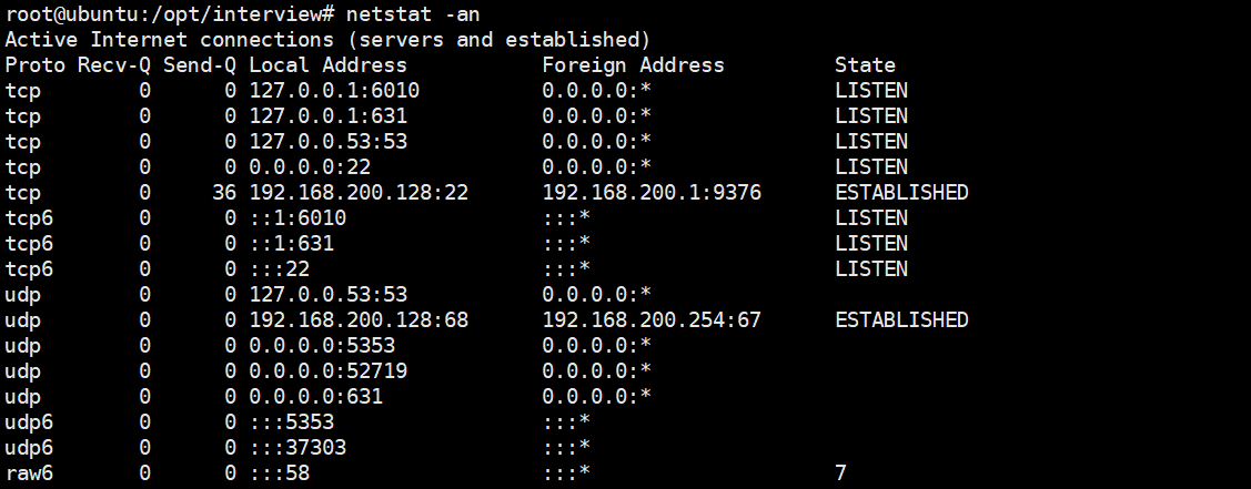 root@ubuntu:/opt/interview# netstat -an | grep ESTABLISHED | awk -F " " '{print $5}' | sort | uniq -c | sort -nr