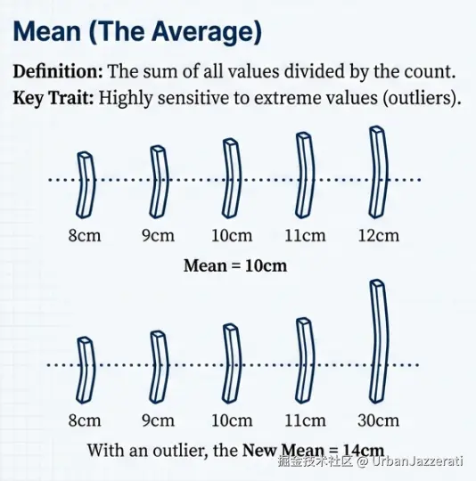 | 指标 | 关注点 | 通俗理解 | 生活应用场景 | 受极端值影响 |