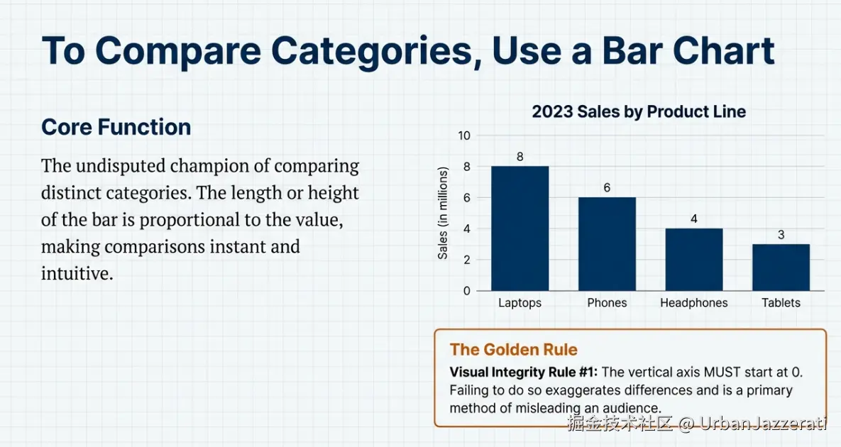 | 条形图 | 精确比较各类别数值大小 | 比较产品销量、国家人口、季度营收等 | 纵轴从0开始;可对类别排序;适合名称长的类别用横向 |