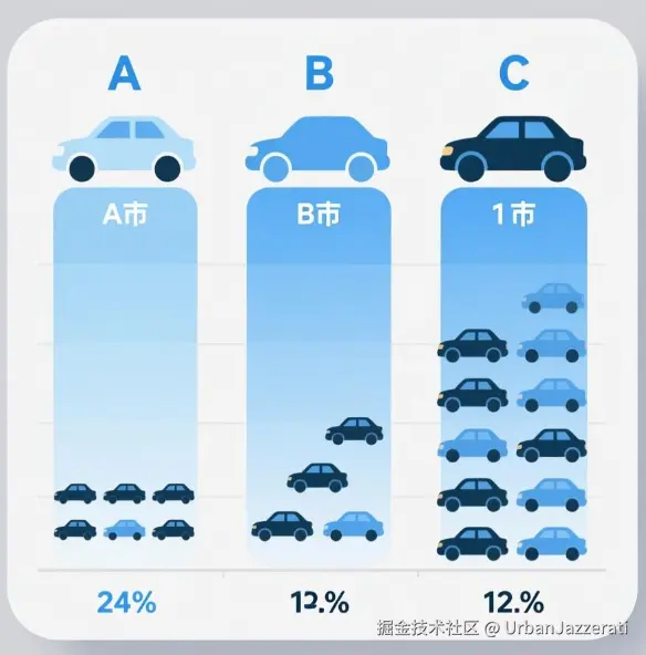 - 图表描述:用三辆小汽车图标排成三行,A城市下面有8辆车,B城市下面有5辆车,C城市下面有12辆车。一眼就能看出C城市最多。
