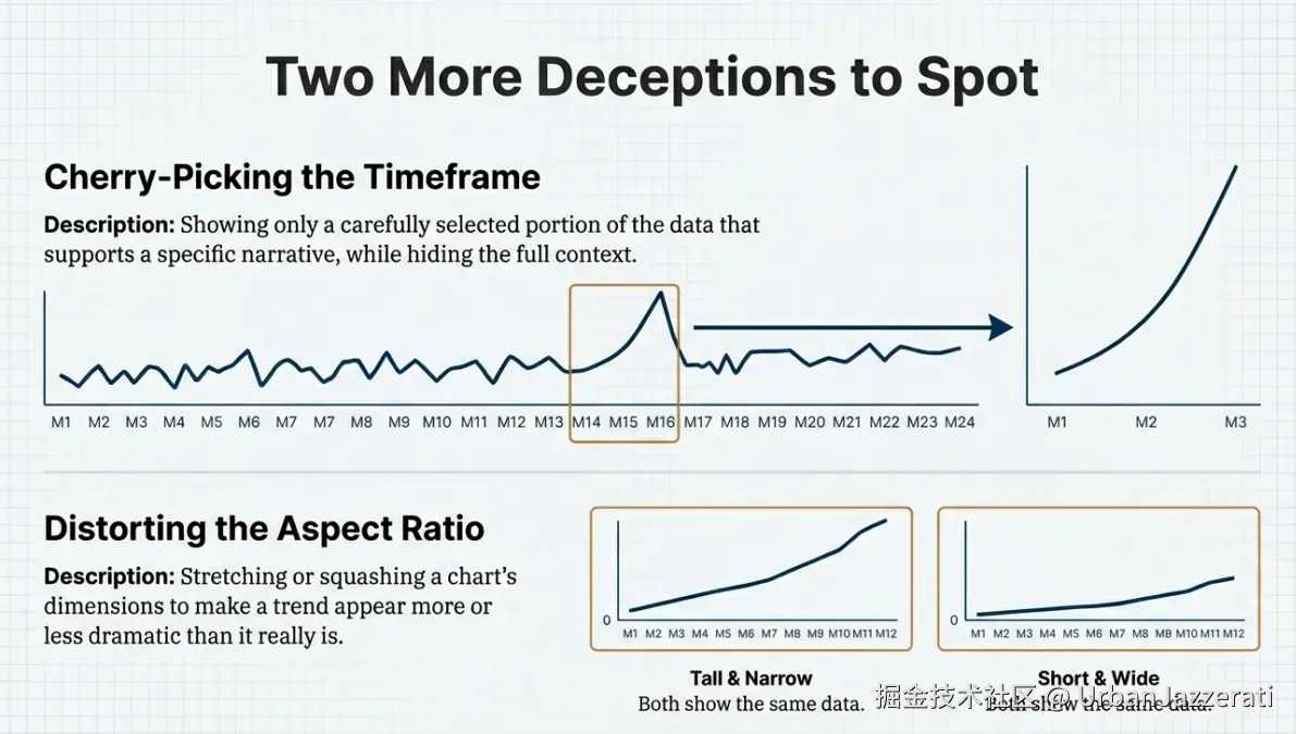 如何识破:关注图表整体的"坡度"。同一个数据,在不同形状的图表里,会讲出完全不同的故事。