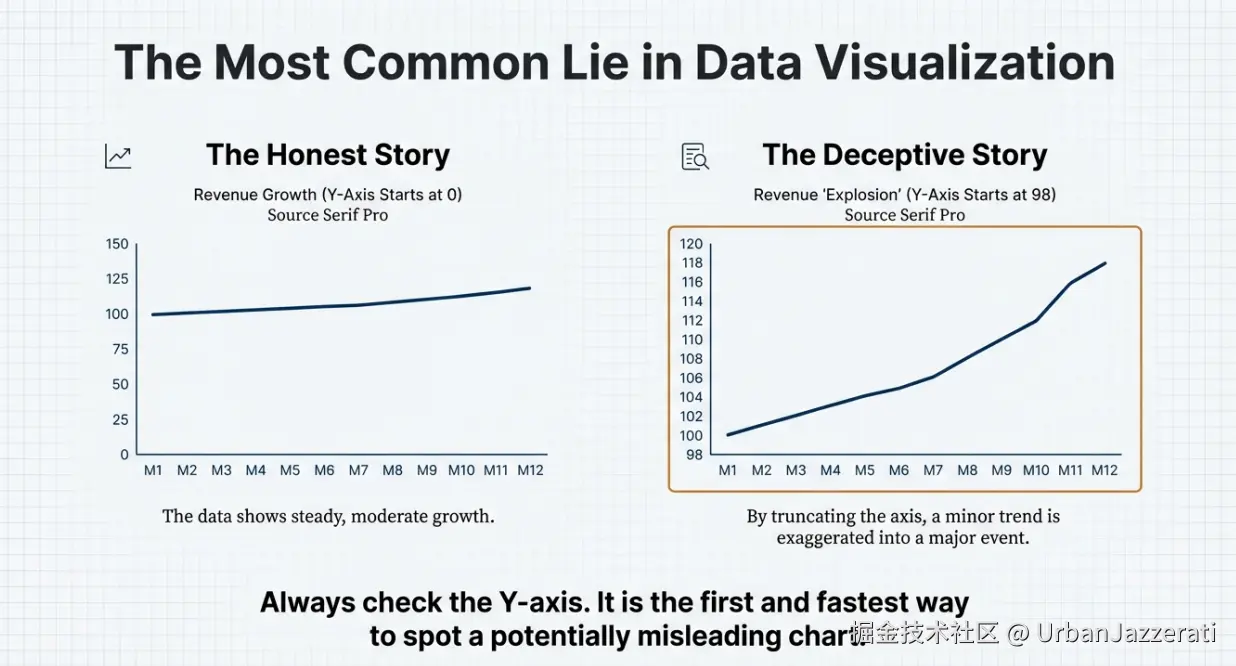 核心心法 :线形图的核心是展示趋势 。任何让趋势的视觉斜率发生非数据本身改变的操作,都可能是误导。