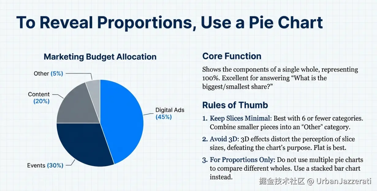 - 务必标注百分比或具体数值,因为人眼不擅长精确比较角度大小。