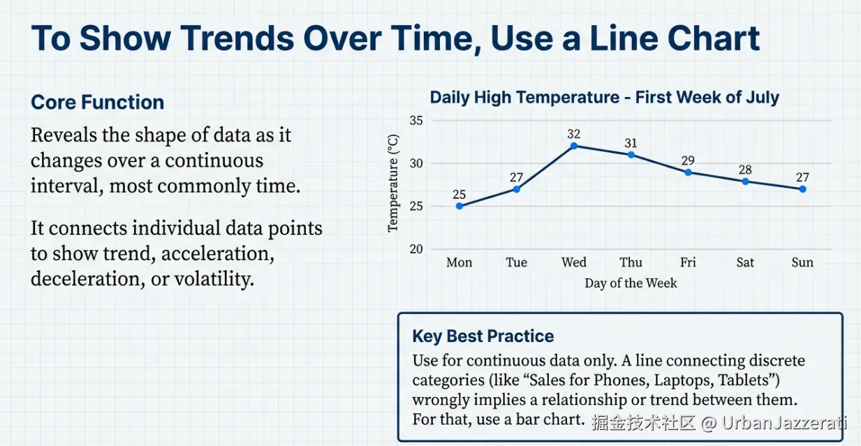 - 连接不应连接的点 :如果数据点代表独立的、非连续的类别(如"苹果、香蕉、橙子"的销量),用线连起来暗示一种趋势或连续性,这是误导的。线形图只应用于连续数据(如时间序列)。
