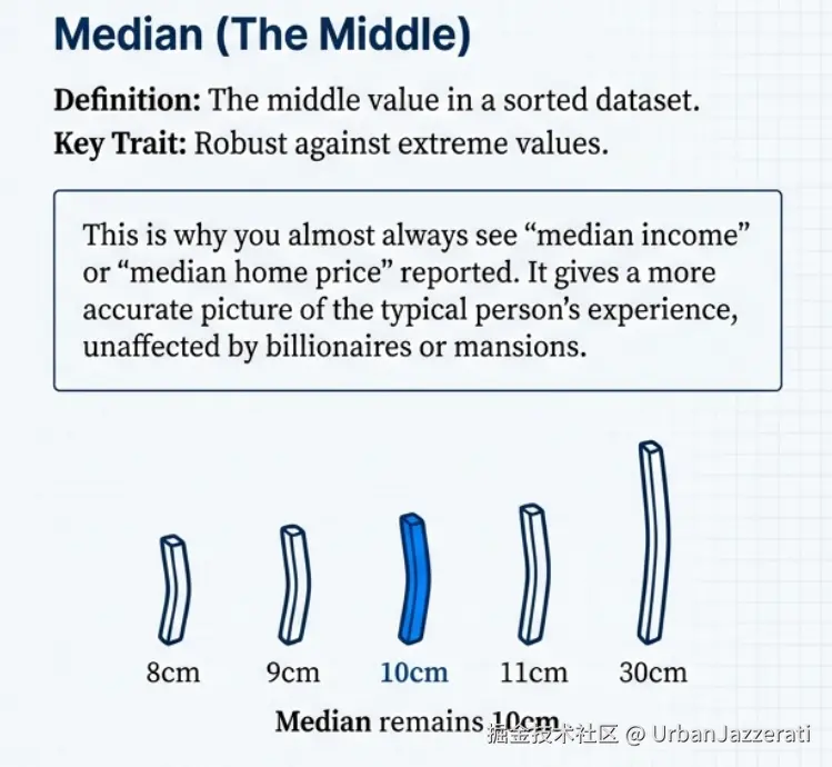 - 加入"巨无霸"薯条:8, 9, 10, 11, 30 → 中位数依然是 10cm。看,它不受影响!