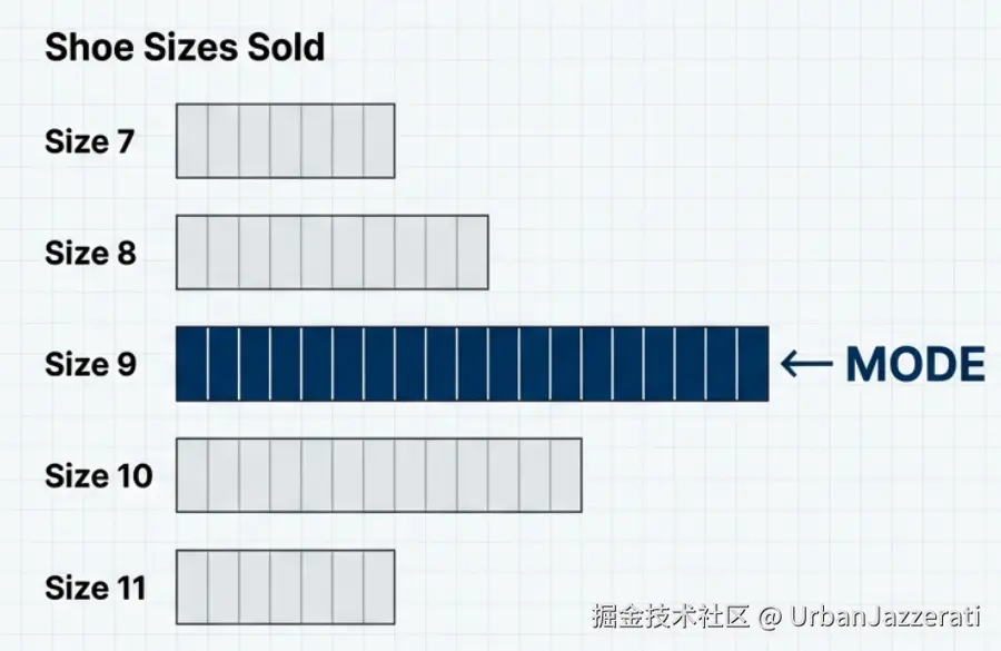薯条例子 :又一批7根薯条长度:8, 9, 10, 10, 10, 11, 12。长度"10cm"出现了3次,最多 → 众数是 10cm。