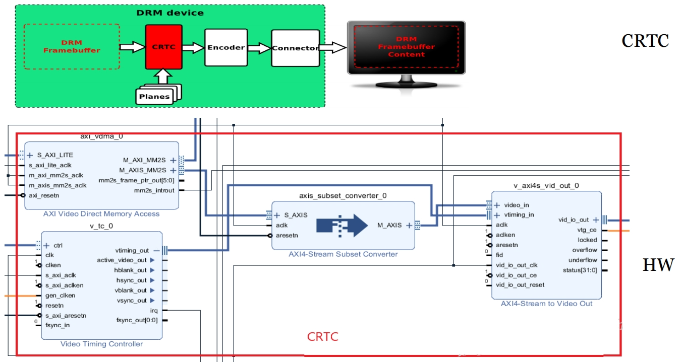 CRTC从DRM Framebuffer和Planes获取图像数据,经图像/视频时序控制,完成流的转化并输出到编码器。上图AXI Video Direct Memory Access 对应DRM Framebuffer,其余为CRTC控制部分,包括video timing controller(时序部分)。