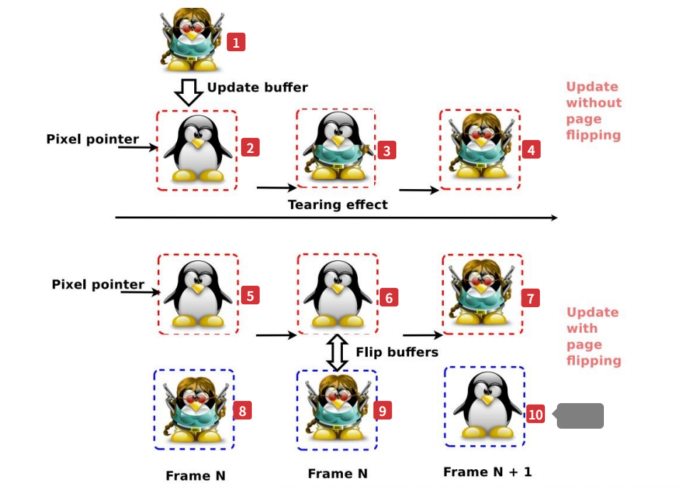 - 翻页更新帧(page flipping)过程:翻页前指向5,在6时直接指向已经绘画完成的9,将不会出现半成品的撕裂效果