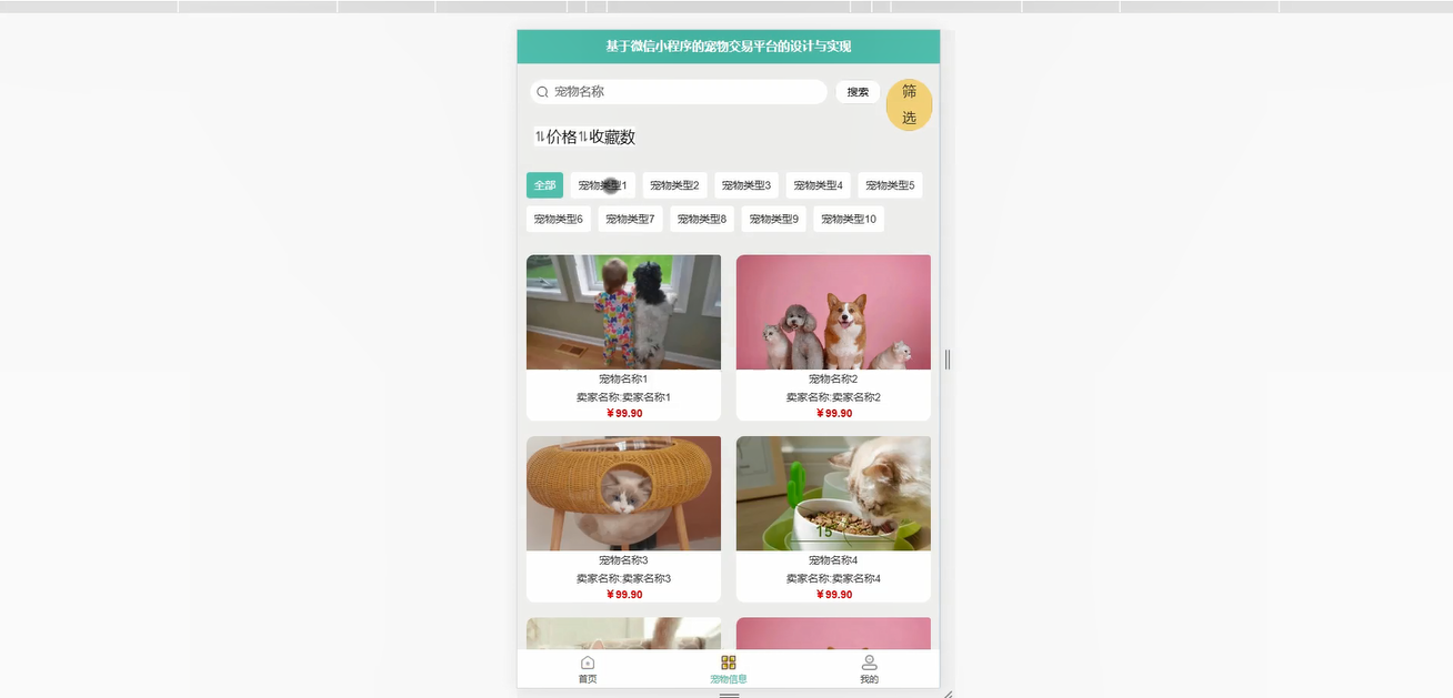 - 核心交易:浏览、搜索、筛选宠物信息(按名称、类型、价格等),查看宠物详情,领取优惠券,实现 "立即购买" 或 "加入购物车" 操作,完成订单提交与支付;