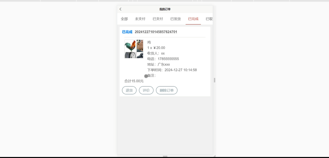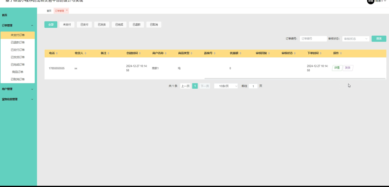 - 核心管理:宠物信息新增、修改、删除,订单状态查看、发货处理、物流信息查询及退款审核。