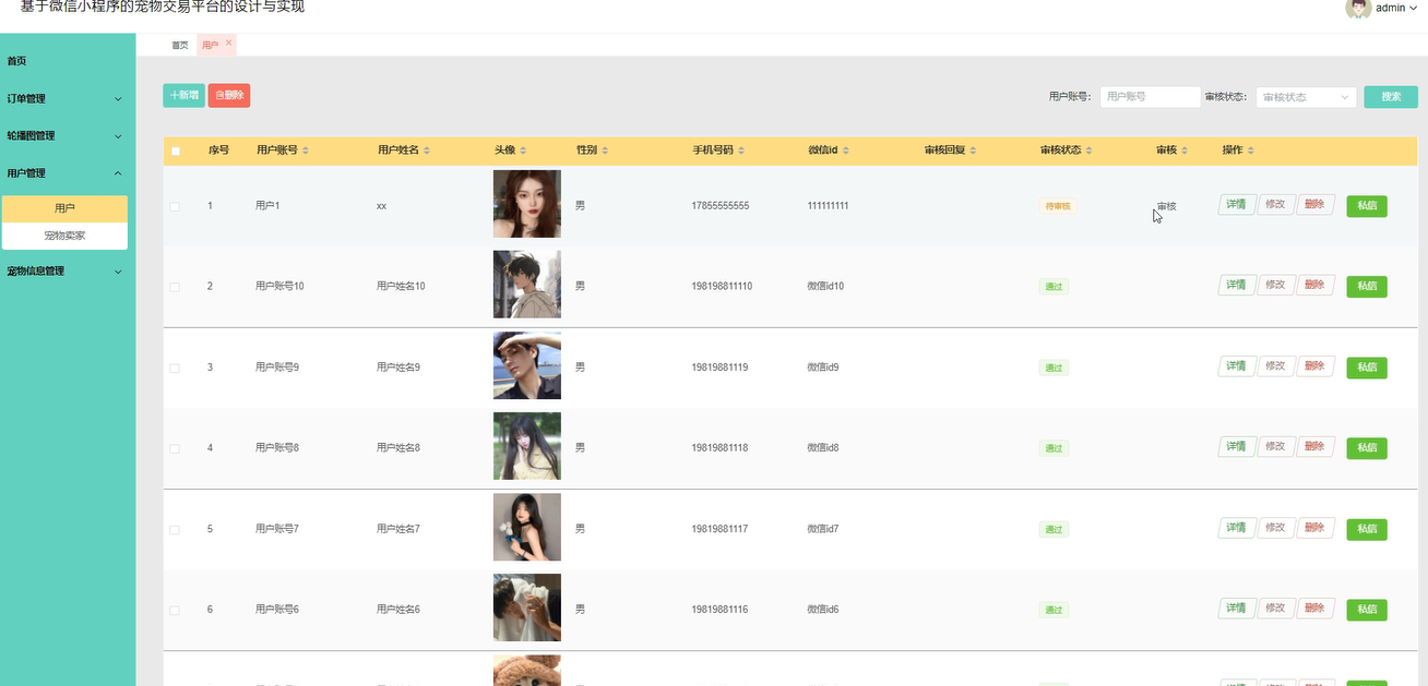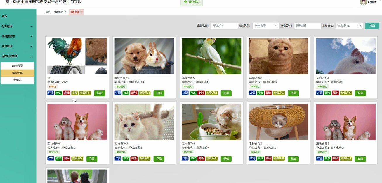 - 核心管理:用户与商家信息审核、新增、修改及删除,宠物信息(含类型)审核与管理,优惠券管理,订单全局查看,轮播图内容修改与删除。