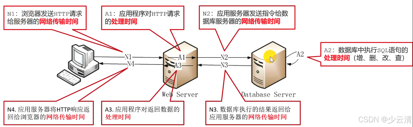 响应时间 = 应用程序处理时间(A1+A2+A3) + 网络传输时间(N1+N2+N3+N4)