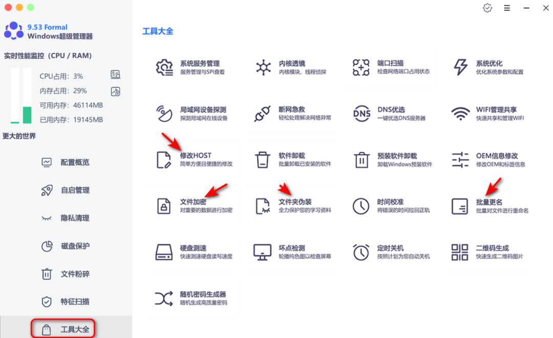工具大全更像个小百宝箱:系统服务管理、端口扫描、系统优化、局域网探测、断网急救啥都有。我最常用的是修改HOST、文件加密、文件夹伪装、批量更名这些,平时都得单独找工具,现在一个软件全搞定,省老事了!