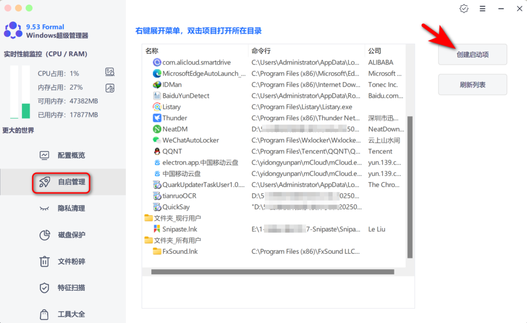 自启管理这块儿特戳我!系统自带的启动管理藏得深,好多选项看不见,它却能揪出所有启动项。右键就能禁用烦人的自启动,右上角还有【创建启动项】,想让哪个程序开机跑,自己设就行。