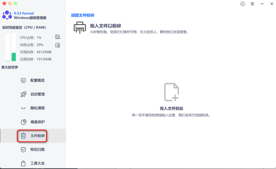 文件粉碎:顽固文件拖入即粉碎,干净利落