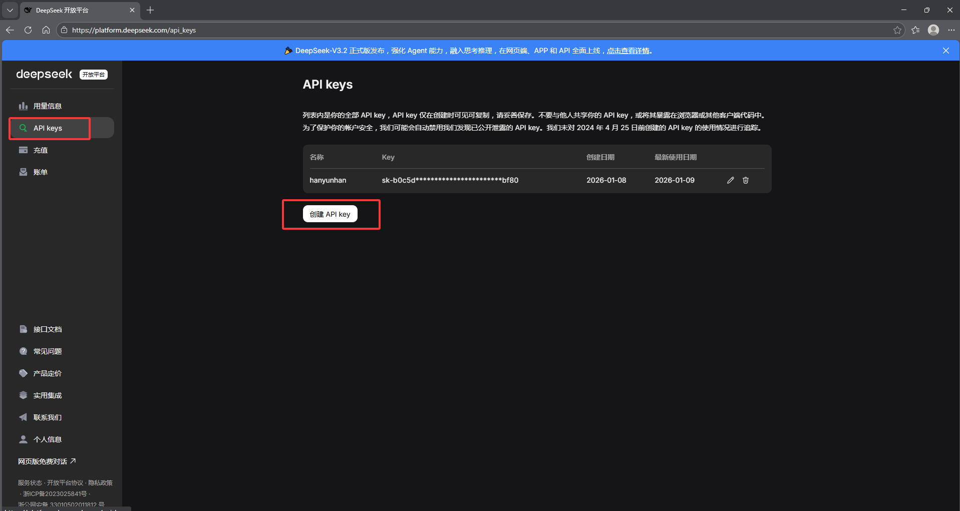 然后点击 API keys 再点击 创建 API key 即可