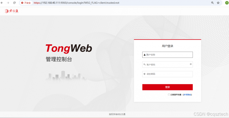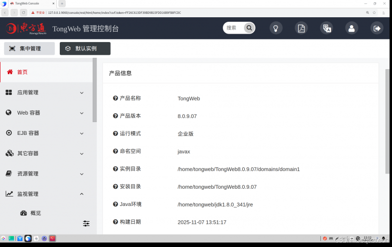 tongweb@node1 \~\]$ java -version java version "1.8.0_341" Java(TM) SE Runtime Environment (build 1.8.0_341-b10) Java HotSpot(TM) 64-Bit Server VM (build 25.341-b10, mixed mode) 3.解压文件 上传TONGWEB安装介质 rz TongWeb8.0.9.07.tar.gz 解压 tar xvf TongWeb8.0.9.07.tar.gz 4.拷贝授权 cd TongWeb8.0.9.07/ rz license.dat 5.启停服务 cd /home/tongweb/TongWeb8.0.9.07/bin ./startserver.sh ./stopserver.sh 6.访问控制台 [https://192.168.40.111:9060/console](https://192.168.40.111:9060/console "https://192.168.40.111:9060/console") 用户名:thanos 密码:thanos123.com
