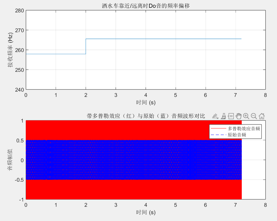 - 靠近阶段(0~2.5 秒):洒水车以 20m/s 速度靠近,Do 音从固有 261.63Hz 升至 278Hz,音调升高约半音,对应日常中 "洒水车驶近时喇叭更尖锐" 的现象;
