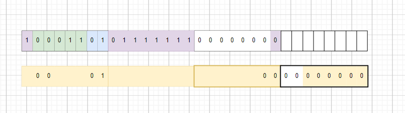 在上面代码中,当前平台会利用一个字节的剩余位,字节用完之后会从左向右使用新字节,比如int_c:10;,紫色部分,横跨三个字节,但是字节的拼接顺序应该是最右边的0 + 中间的01111111 + 最左边的1,也就是小端字节序。0011111111:255。