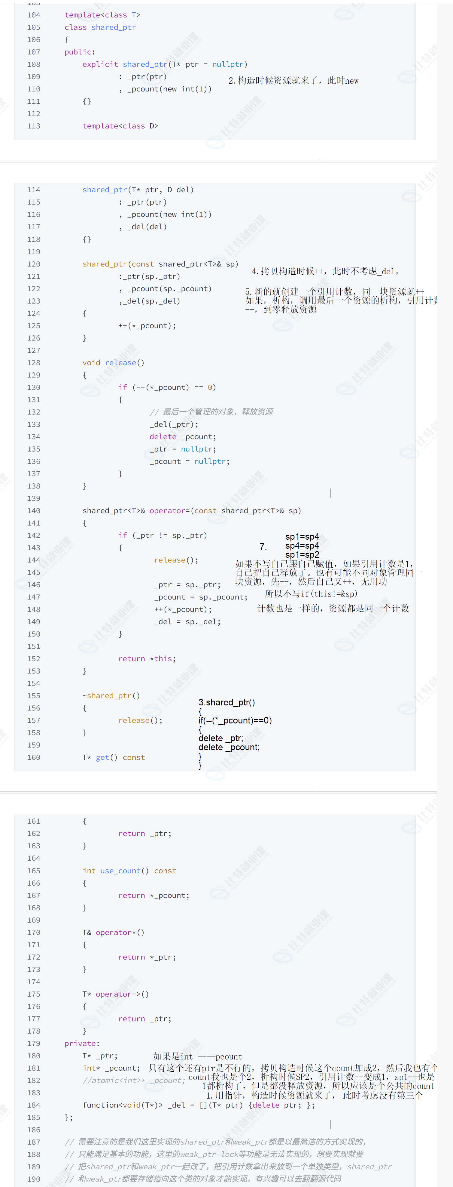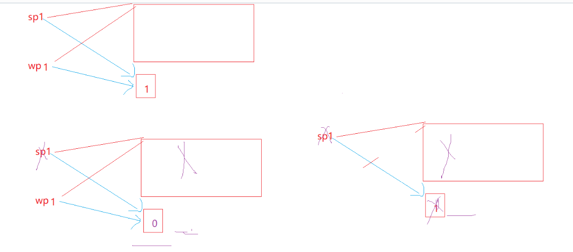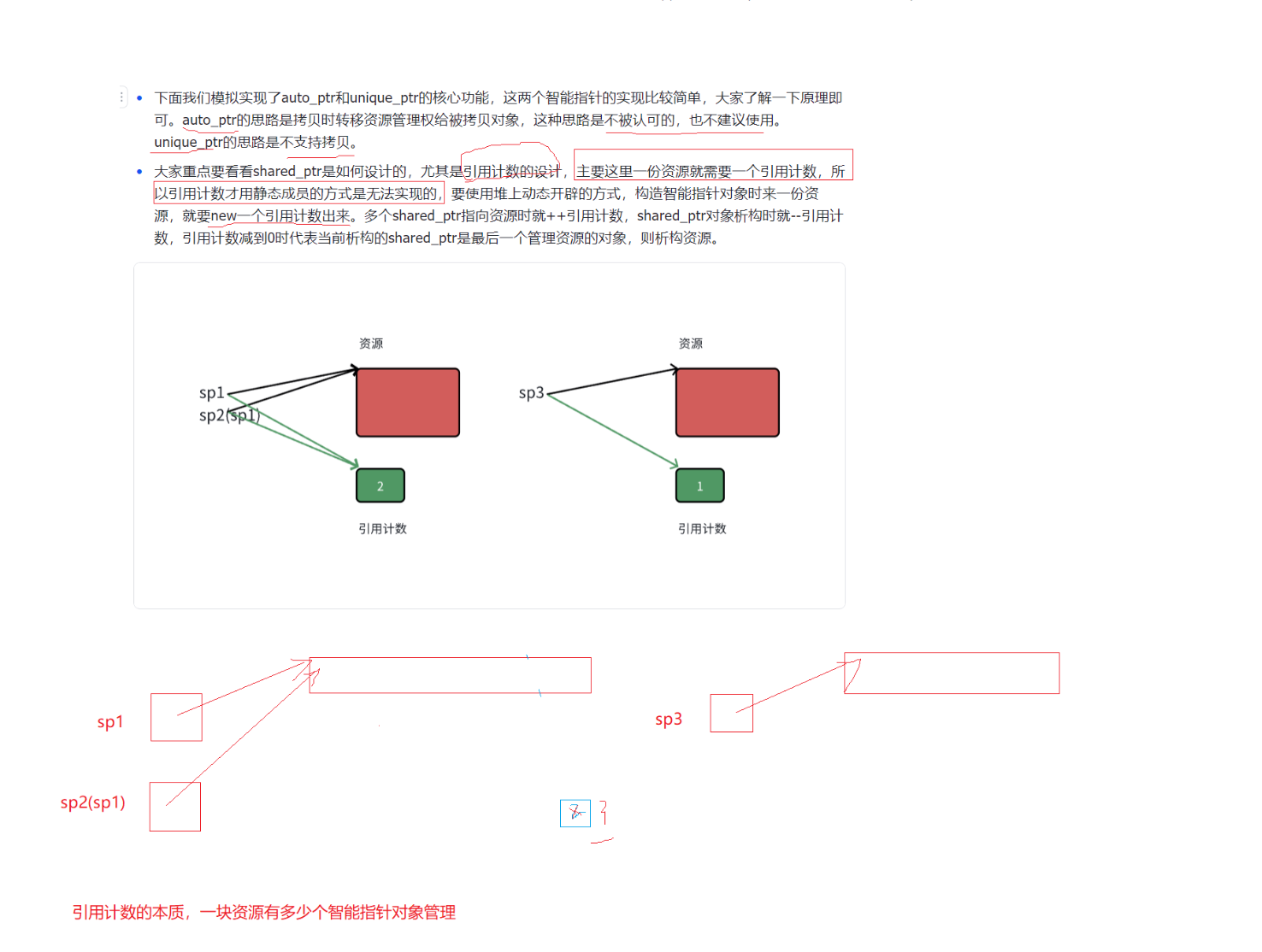 右边share ptr引用计数到9,就释放,左下减到0不释放,我怎么知道这个引用计数有没有人指向所以再加一层引用计数,weak ptr不参与资源管理但是参与引用计数管理