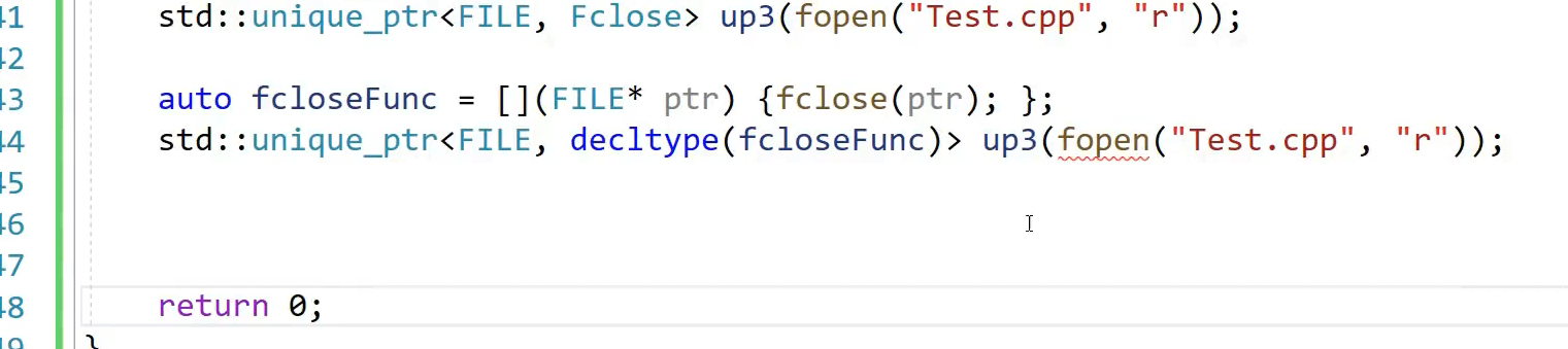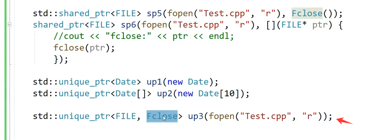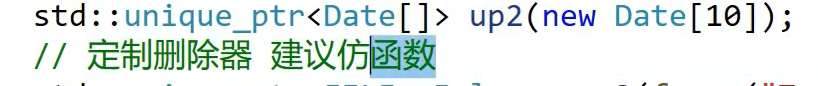 unnique在下层用这个类型实例化出一个仿函数对象,share ptr用啥都好用(lamda 仿函数 函数指针,,,),但是unique仿函数好用,lamda不好用 ,在函数参数传个lamda没毛病,模版参数传lamda,就有困扰,拿不到类名。之前share是通过实参传给形参,自动推导lamda类型,unique必须传类型,lamda不行,这么办: