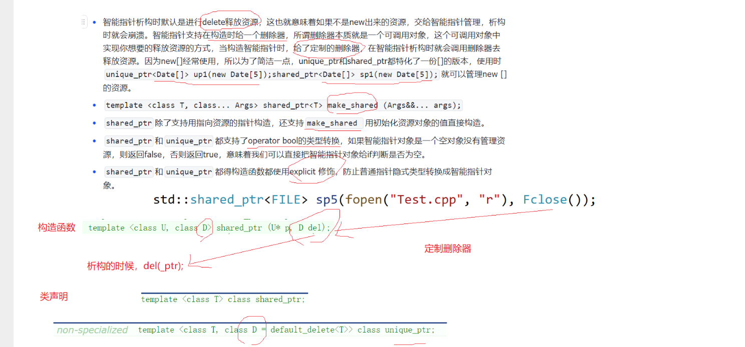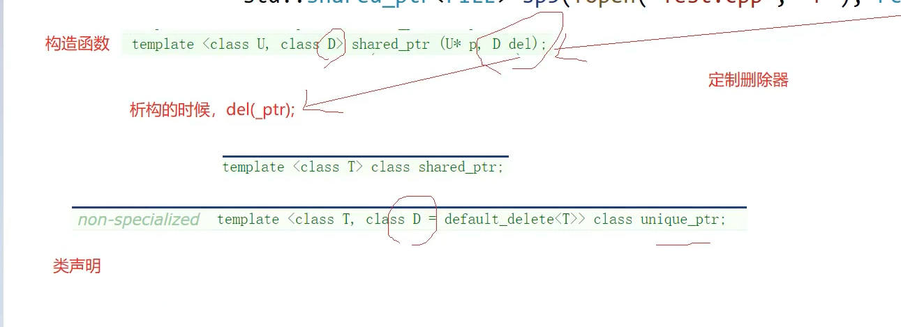 这个关键字可以推导类型。lamda底层还有一些限制还是不行,,构造地方也要显示穿,因为lamda类型不支持默认构造,所以生成不出来,所以传一个对象过去,用这个对象拷贝构造,unique定制删除器就用仿函数,shareptr 定制删除器都可以相对建议lamda。