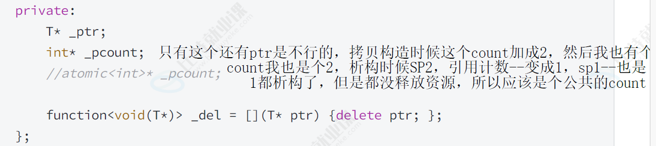 三个对象共享这个引用计数,这就不对了,指向不同资源,静态属于管理这个类型的所有对象,而我们只是想要管理某个对象的引用计数。用动态开辟方式