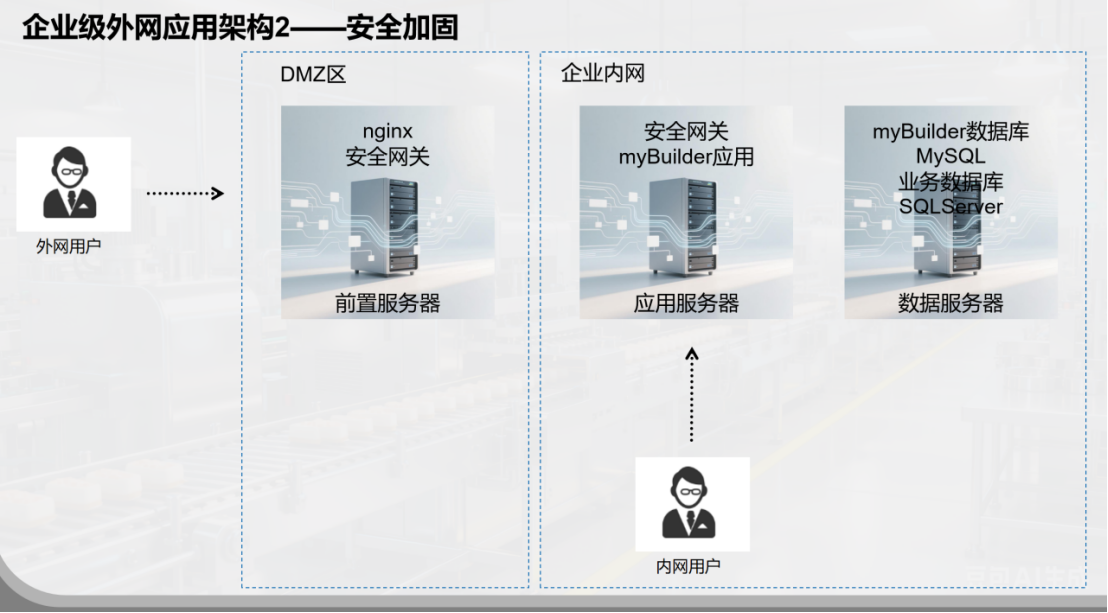 服务器规划与内网大致相同,核心区别在于应用服务器需额外安装nginx反向代理。通过nginx绑定外部域名、对外开放443或80端口、部署SSL证书等操作,可起到隔离作用,避免直接暴露myBuilder应用的内部端口。