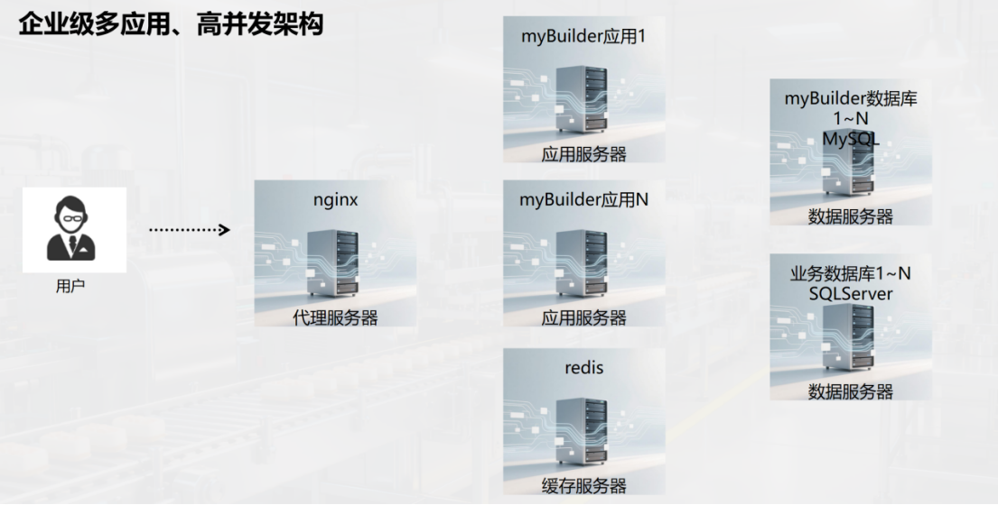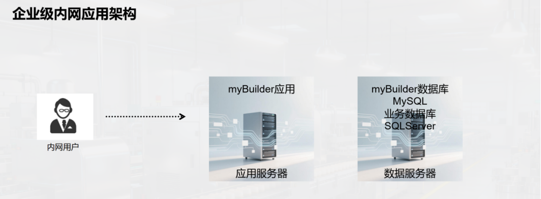 我们需准备一台应用服务器部署MyBuilder应用,再准备一台数据服务器部署myBuilder数据库及业务数据库。业务数据库建议选用SQLServer,对中小企业而言是性价比更高的商业数据库。这套架构支持三千至五千用户同时使用。