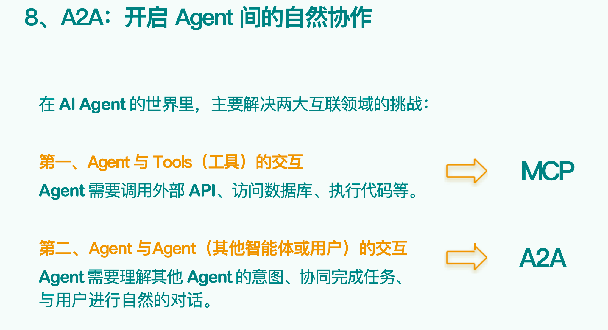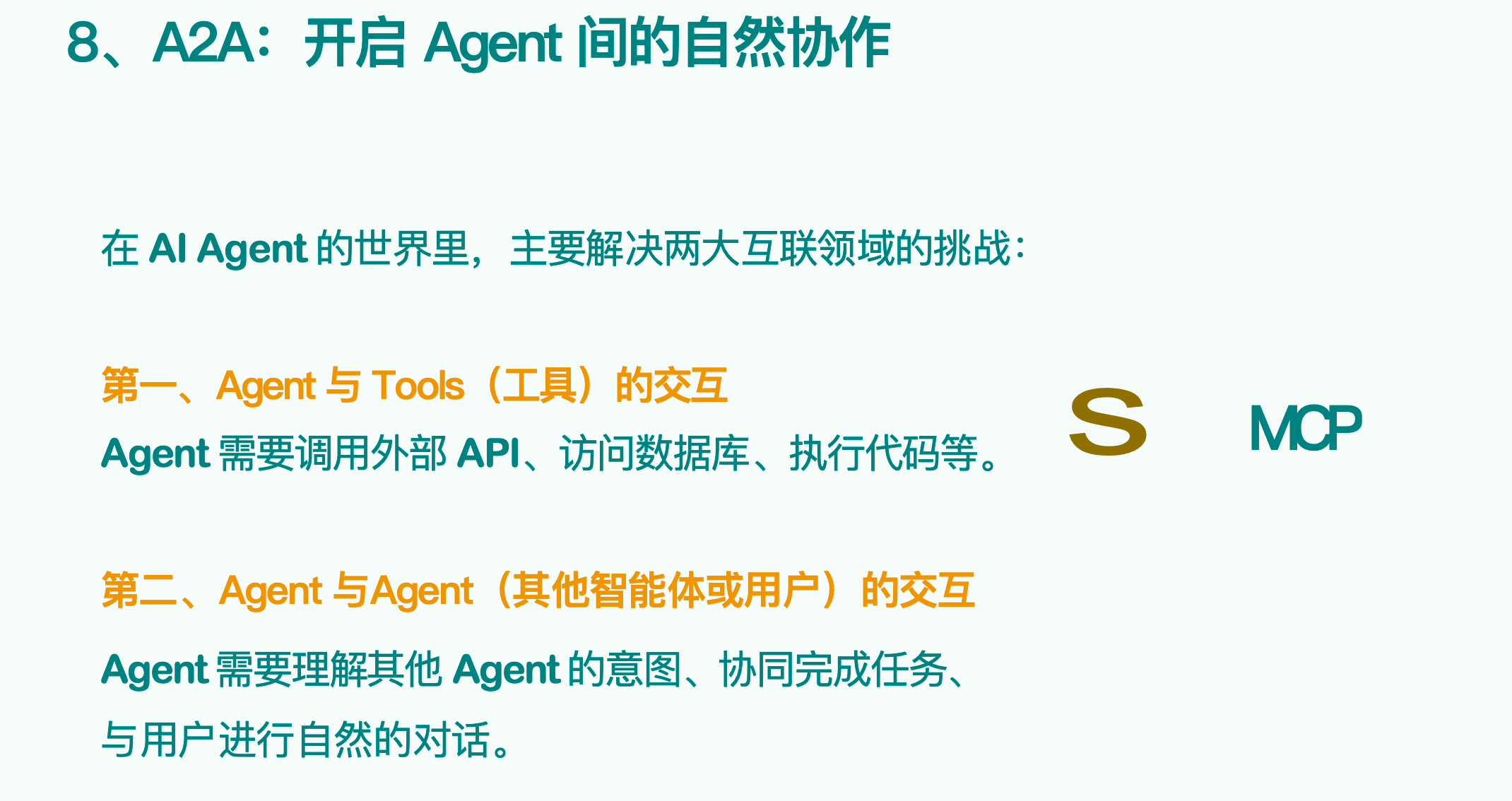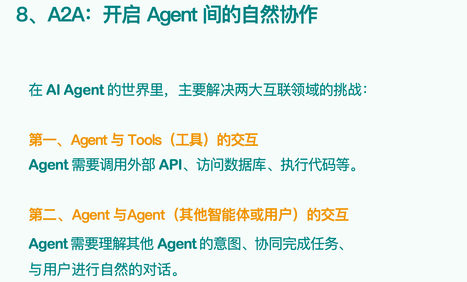 Agent 需要理解其他 Agent 的意图、协同完成任务、与用户 进行自然的对话。AT2A