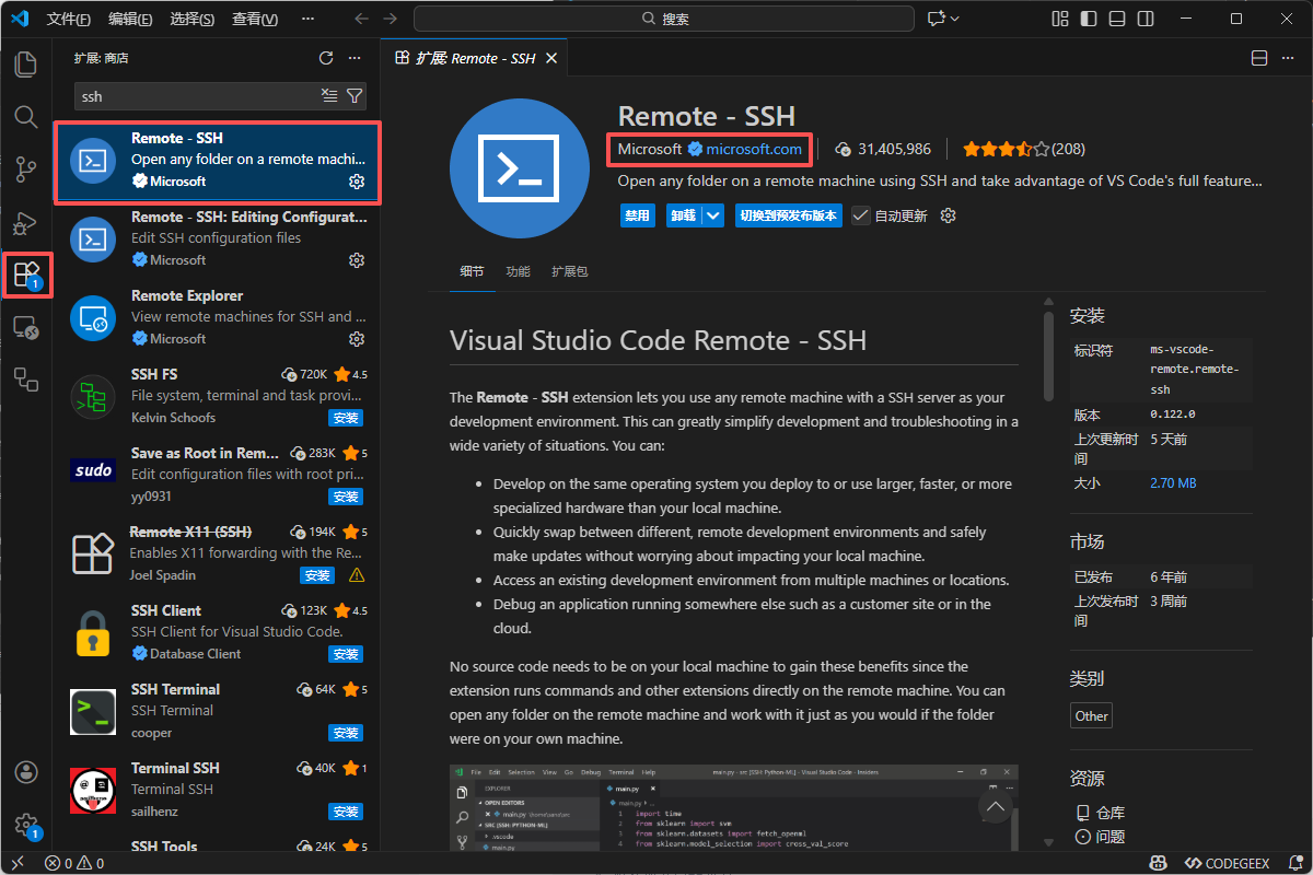 Remote - SSH。 - 选择由 Microsoft 发布的插件,点击 Install (安装)。