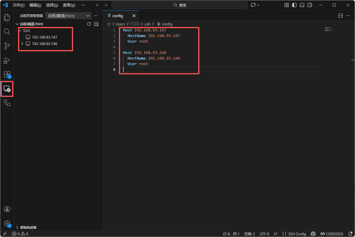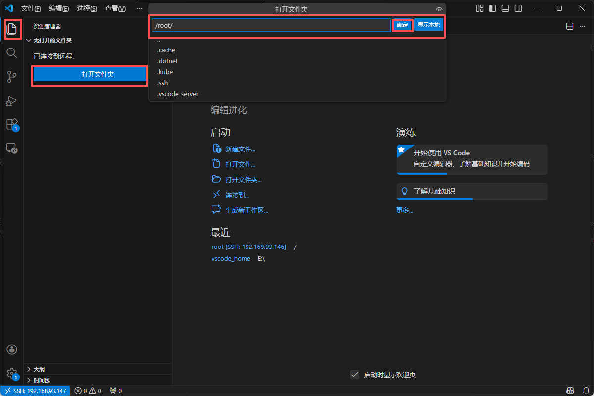 SSH: 192.168.93.147,且左上角的资源管理器将变为空状态。