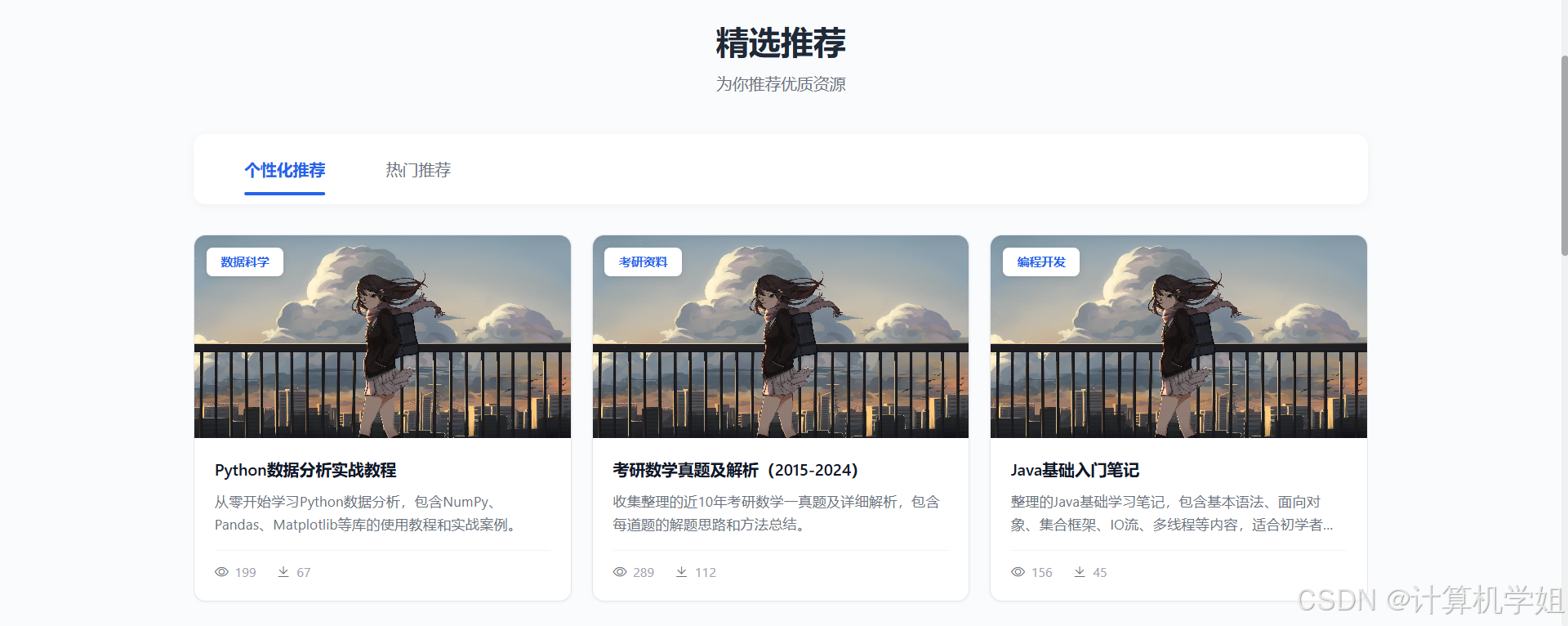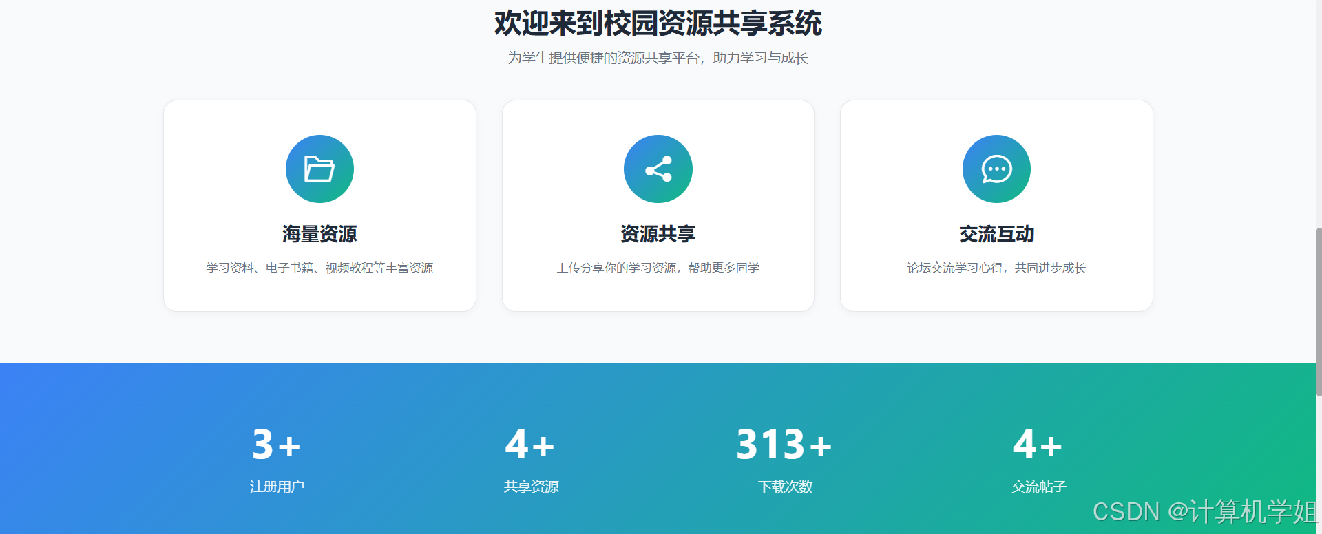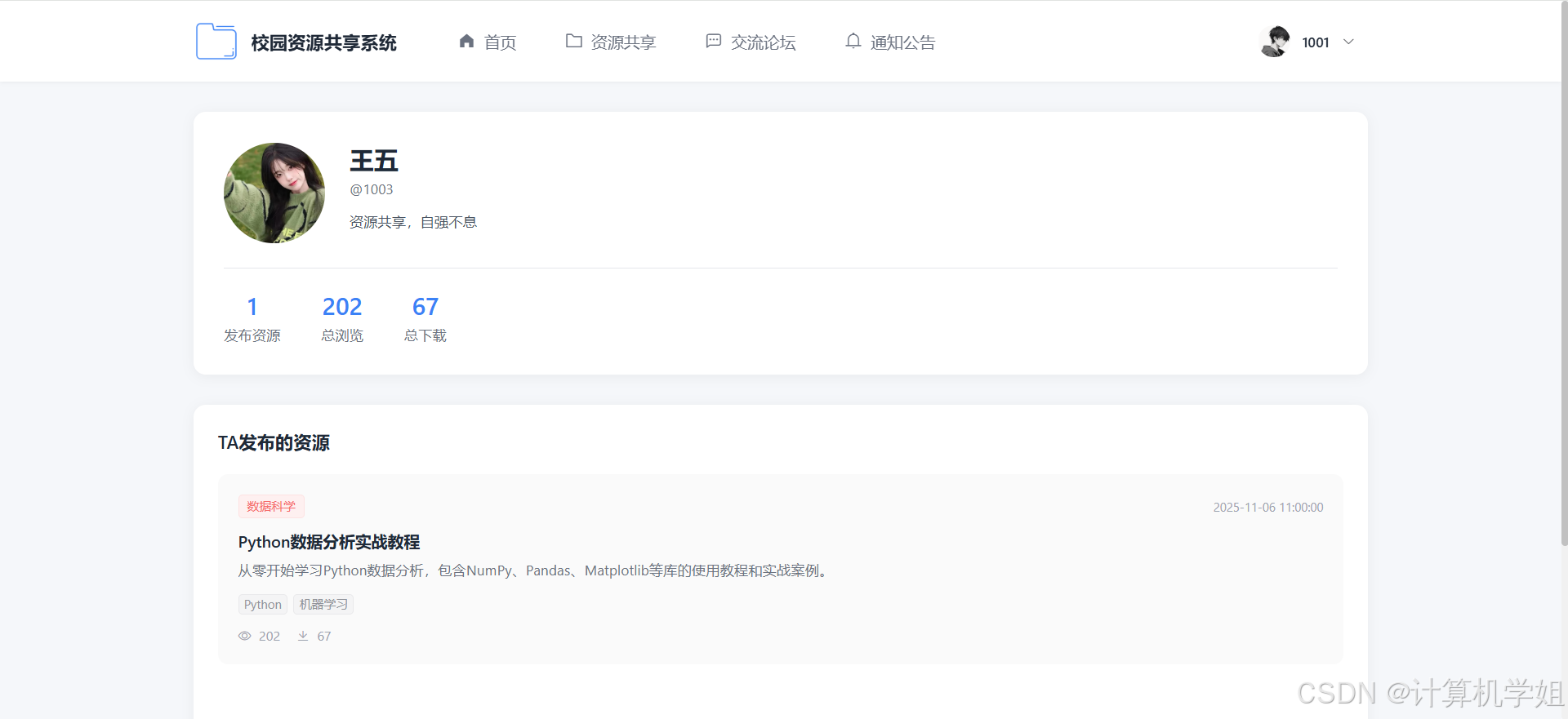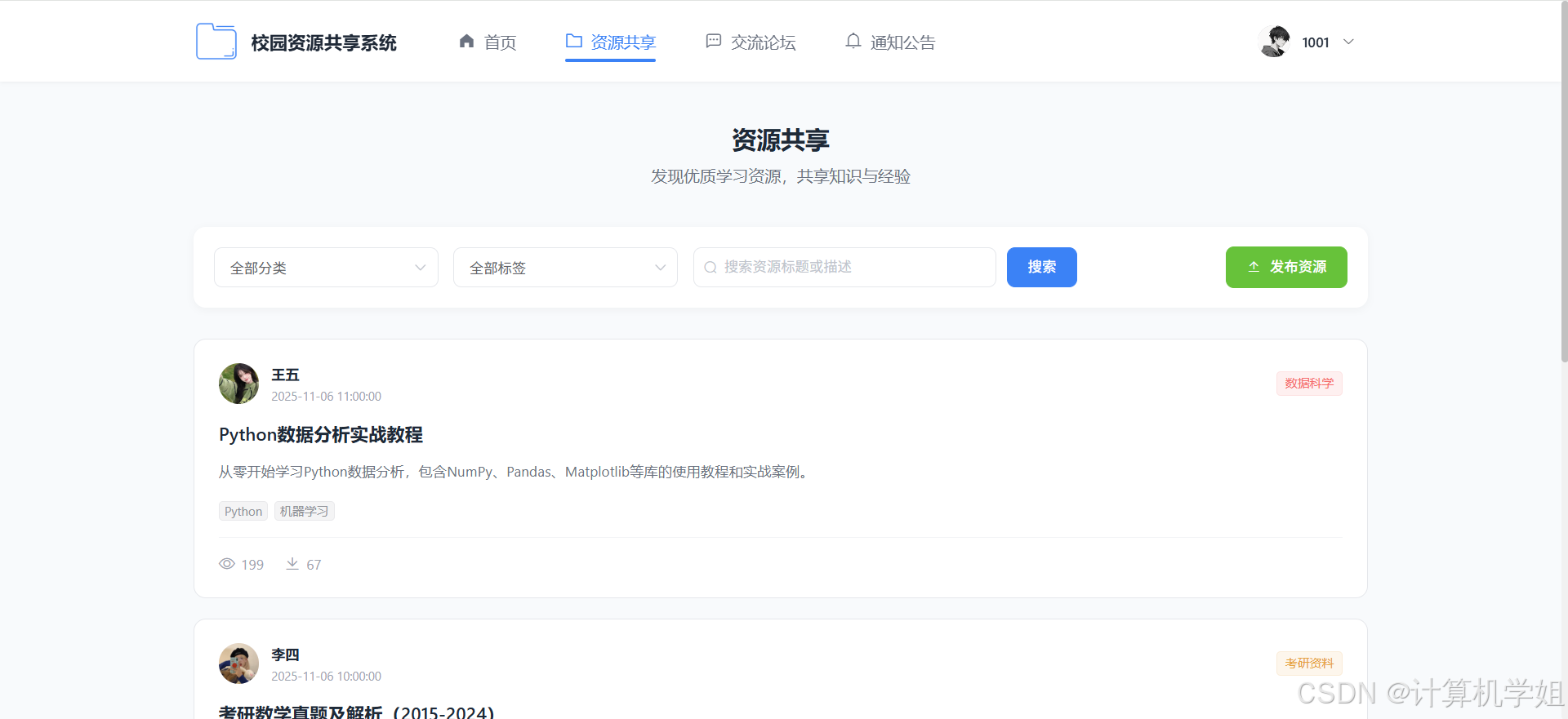 【2026最新】基于Java+SpringBoo+Vue+MySQL的校园资源共享系统,个性化推荐算法,数据可视化统计,发布资源,资源举报,标签分类,用户主页,交流论坛,个人中心等