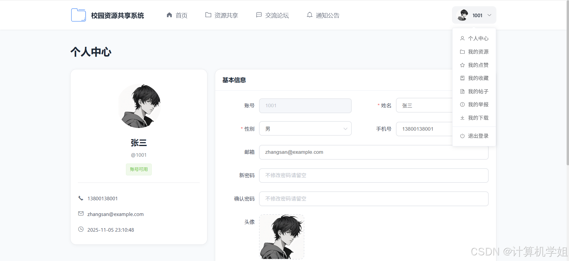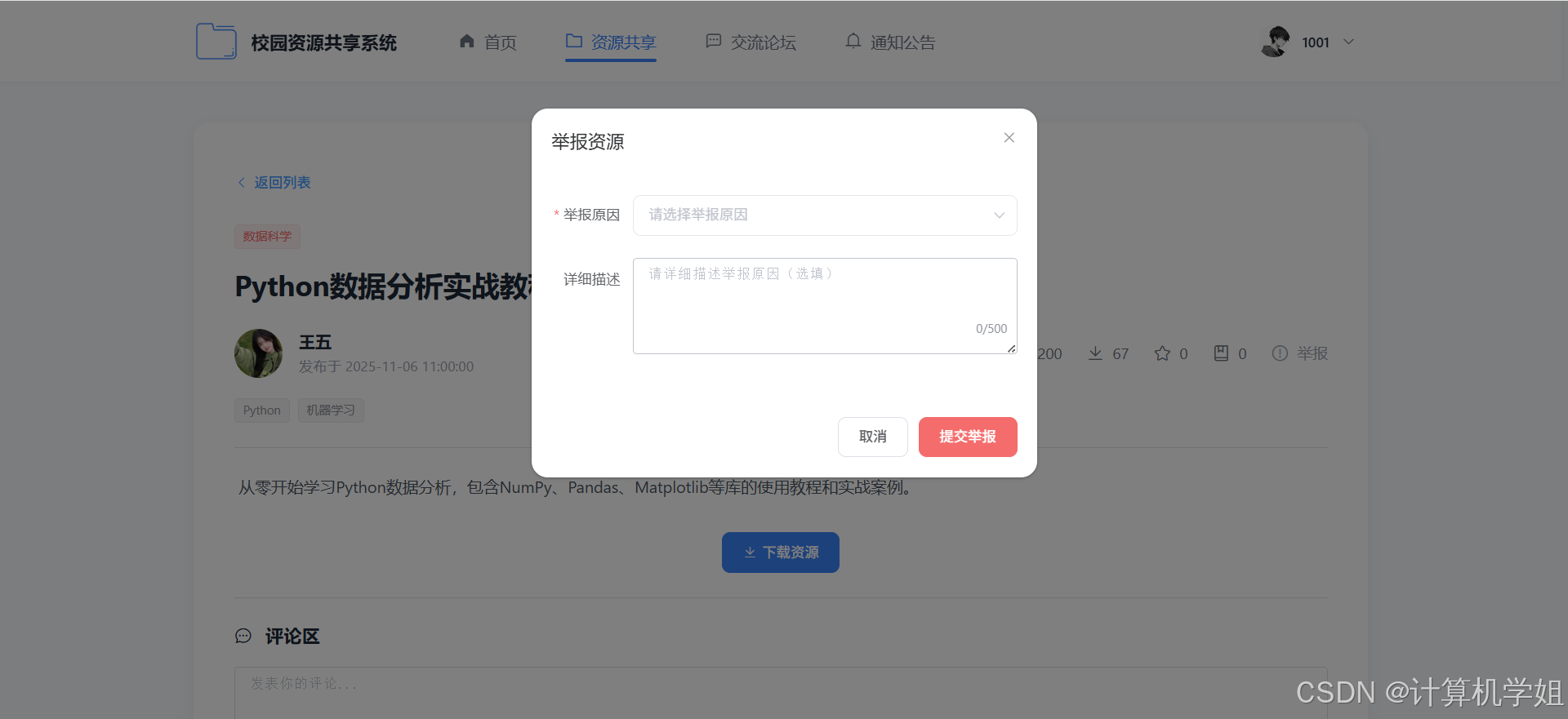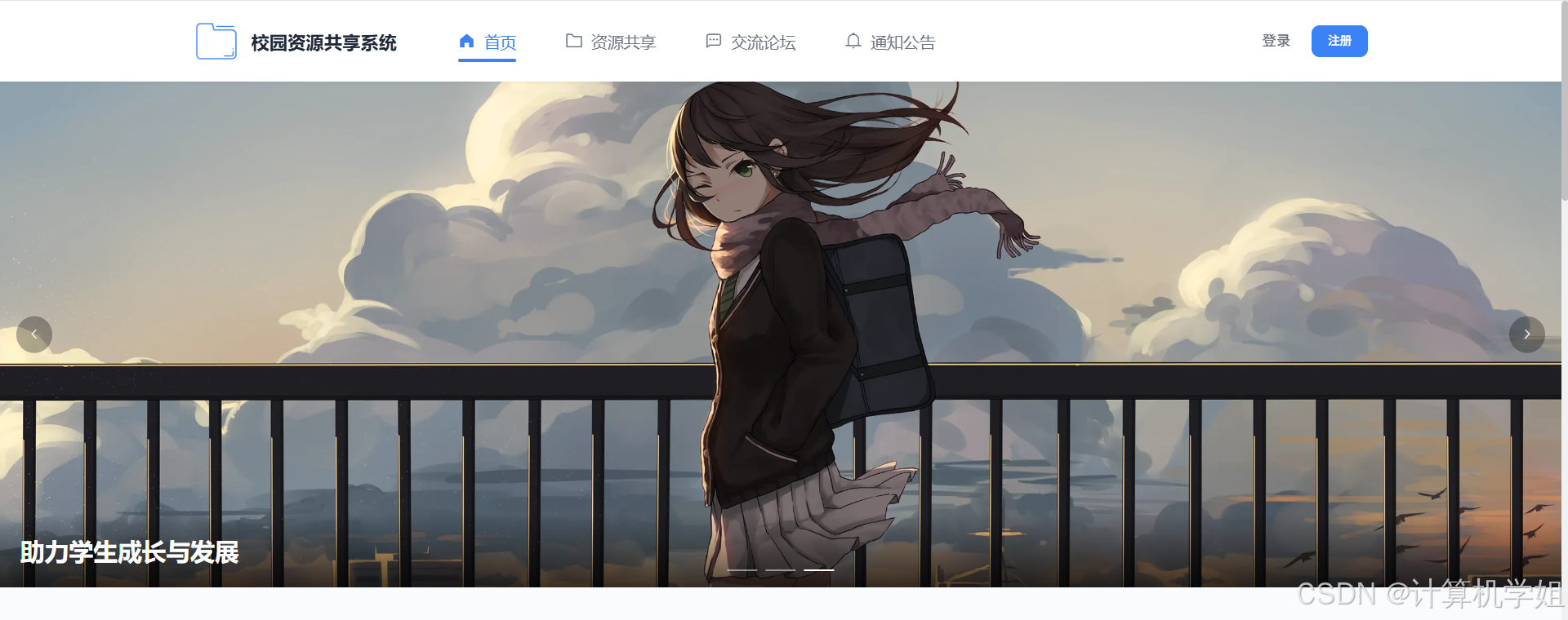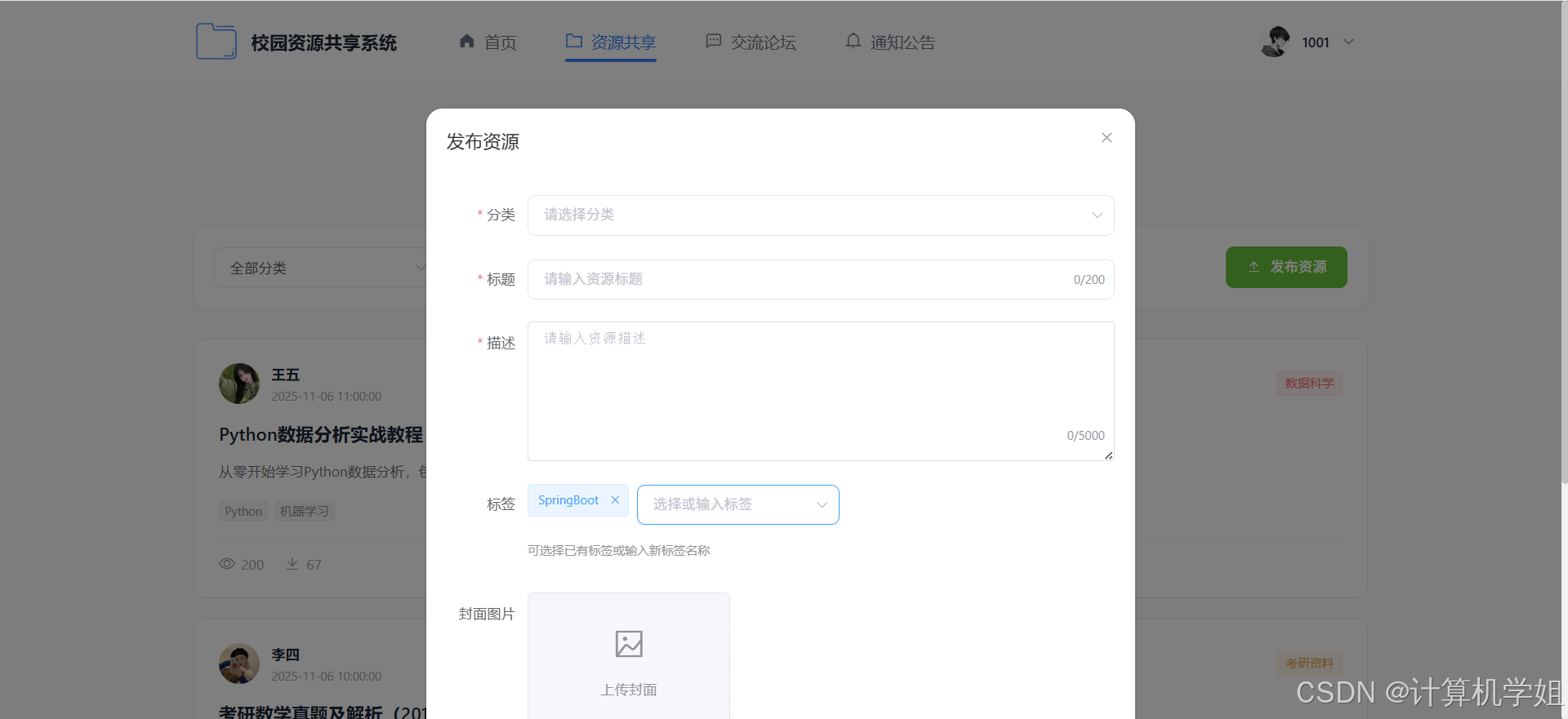【2026最新】基于Java+SpringBoo+Vue+MySQL的校园资源共享系统,个性化推荐算法,数据可视化统计,发布资源,资源举报,标签分类,用户主页,交流论坛,个人中心等