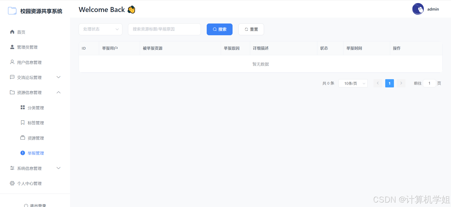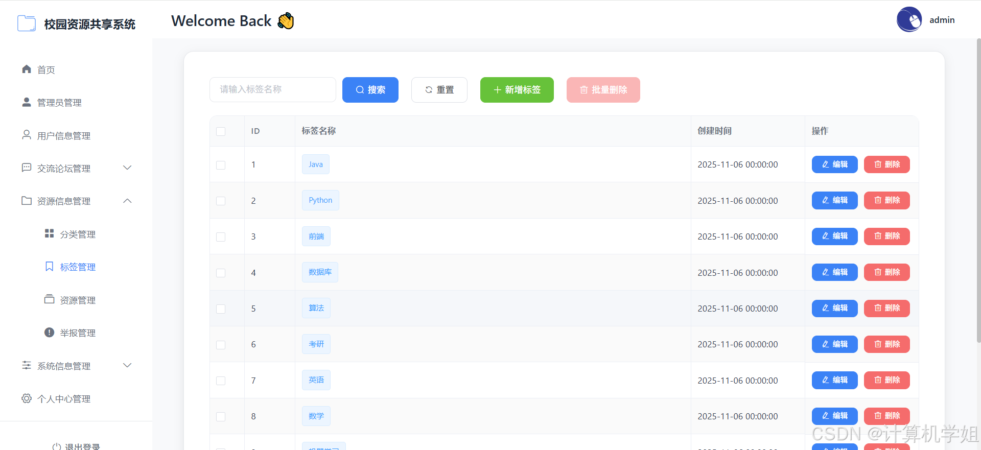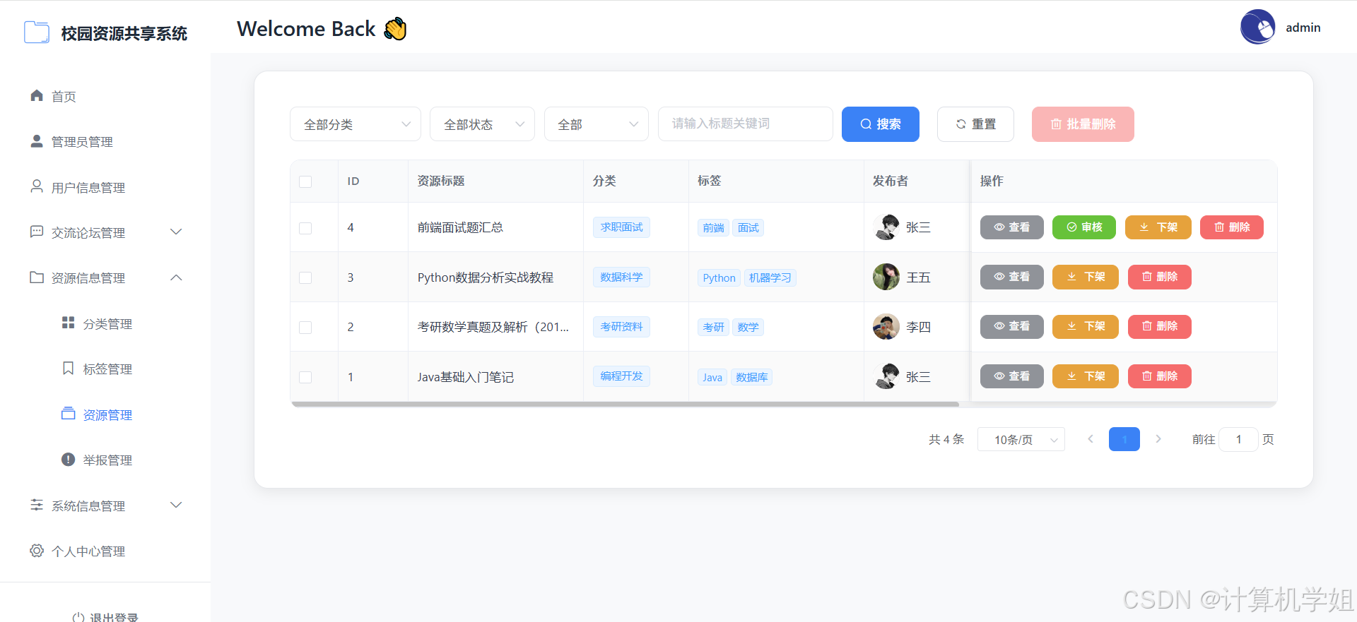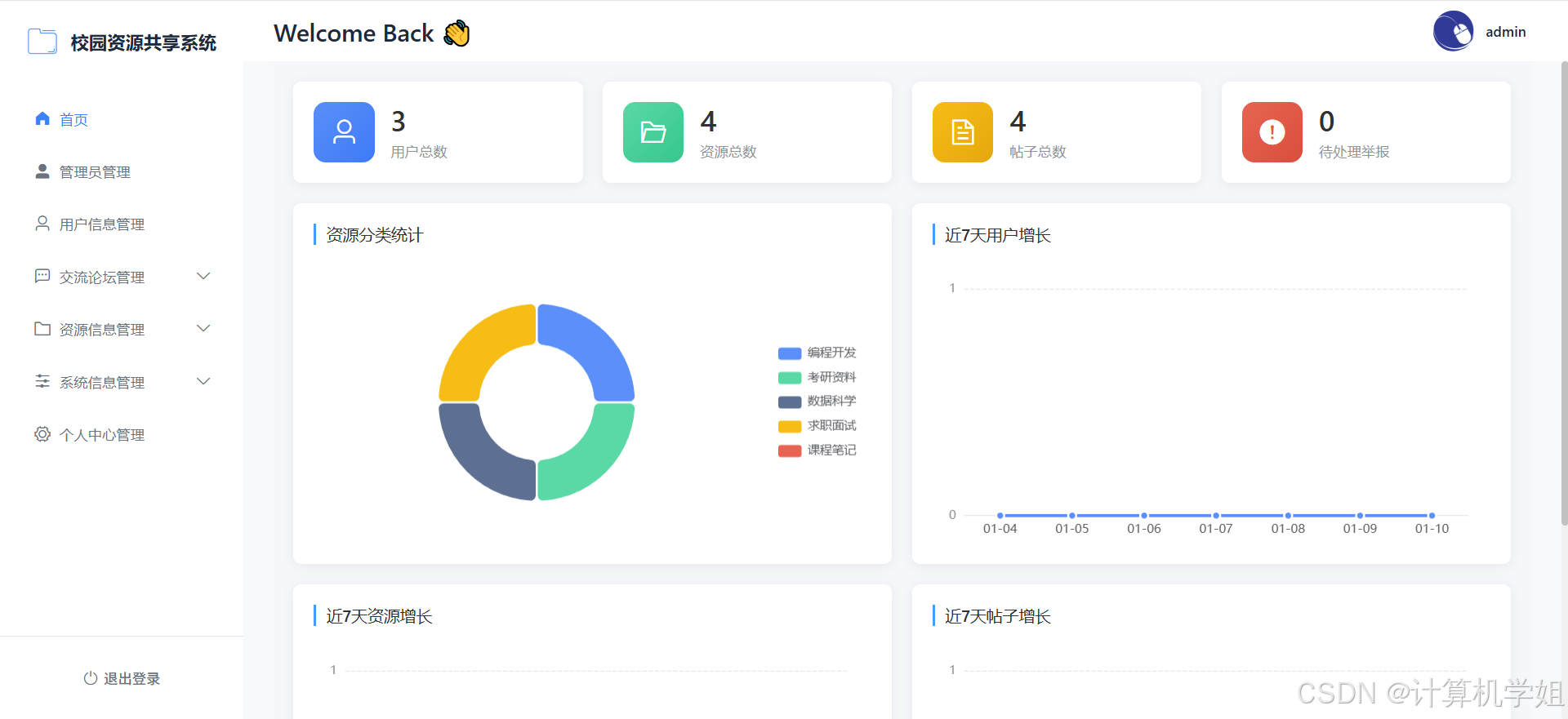 【2026最新】基于Java+SpringBoo+Vue+MySQL的校园资源共享系统,个性化推荐算法,数据可视化统计,发布资源,资源举报,标签分类,用户主页,交流论坛,个人中心等