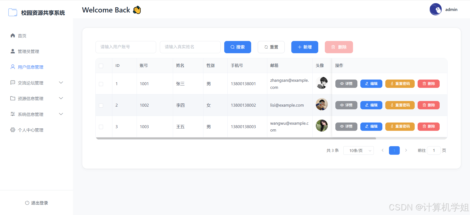 在数字化校园建设背景下,校园资源共享是提升教育质量、促进学术交流的重要环节。传统校园资源管理方式存在信息分散、检索困难、共享效率低等问题,导致大量优质资源闲置或重复建设。基于SpringBoot+VUE+MYSQL的校园资源共享系统,通过技术手段整合校园内分散的资源,构建统一的资源管理平台,具有重要的现实意义。首先,该系统能够打破部门壁垒,实现资源跨部门、跨学科的共享,提高资源利用率,避免重复采购与建设,降低校园运营成本。其次,系统提供便捷的资源检索与下载功能,支持按关键词、分类、标签等多维度搜索,帮助师生快速定位所需资源,提升学习与科研效率。此外,系统支持用户上传与分享个人资源,形成"人人参与、共建共享"的资源生态,激发校园创新活力。对于高校管理者而言,系统提供资源使用统计与分析功能,为资源优化配置提供数据支持,助力智慧校园决策。从教育信息化角度,该系统是校园数字化转型的重要实践,通过技术赋能推动教育资源共享模式创新,为其他领域资源共享提供借鉴。同时,系统的开发涉及前后端分离、数据库设计、接口开发等核心技术,有助于提升开发者的技术实践能力,培养复合型技术人才。