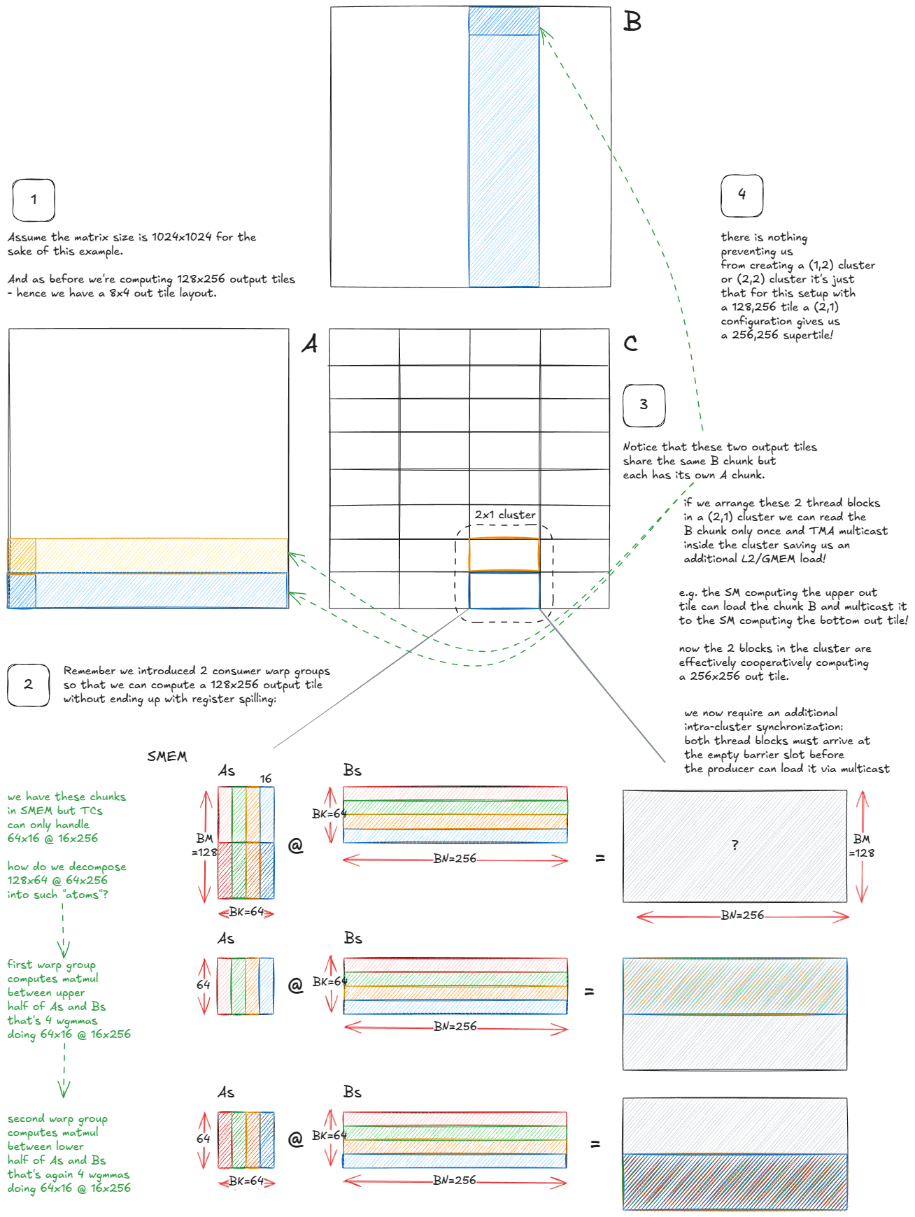 从调度角度来看,并没有根本性的变化:不再是每个SM各自独立处理输出块,而是整个集群协作处理一个更大的"超级块"。算法的运行机制保持不变,但现在这些SM需要协调负载并重用彼此的数据。