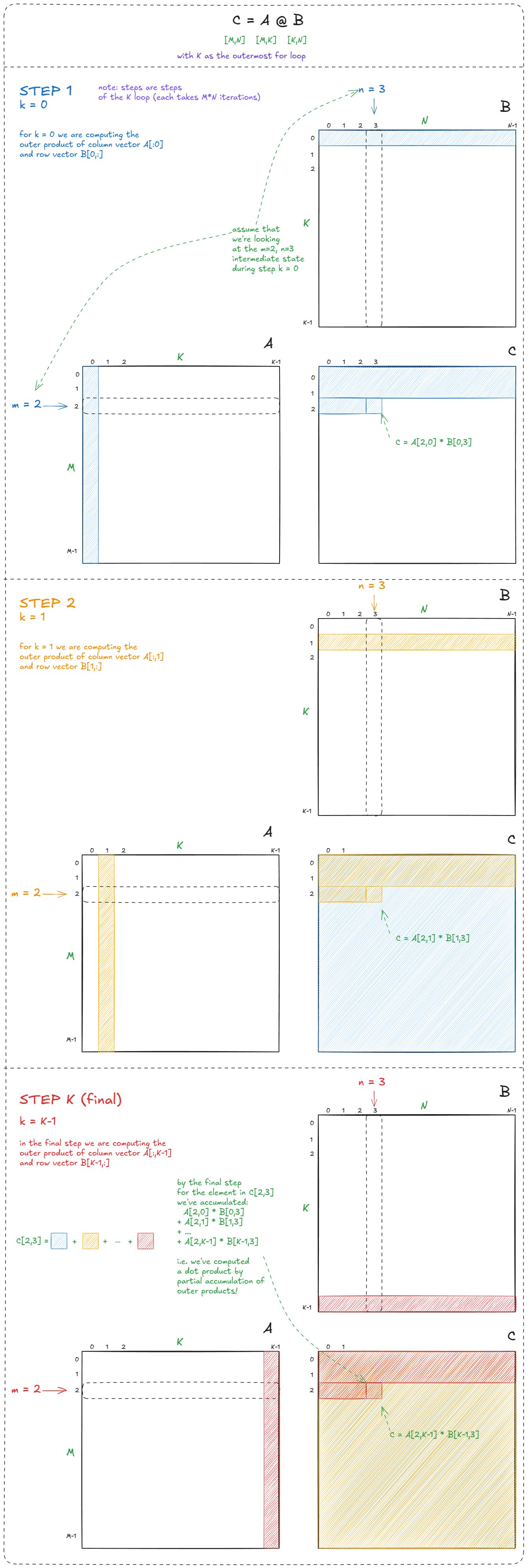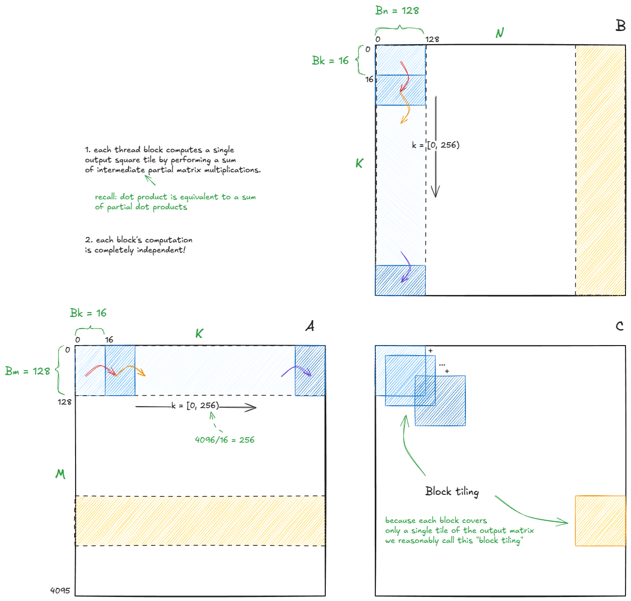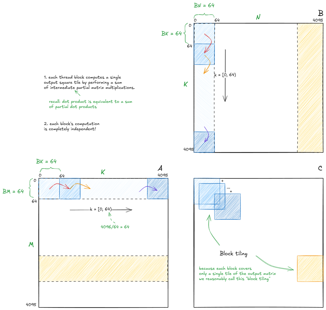 我们一路学习了一些关键概念------瓦片和波的量化、占用率、整数线性规划、屋顶线模型------并围绕基本等价性建立了直觉:点积可以表示为部分外积之和,或者表示为点积的部分和,以及为什么正方形瓦片会产生更高的算术强度。
