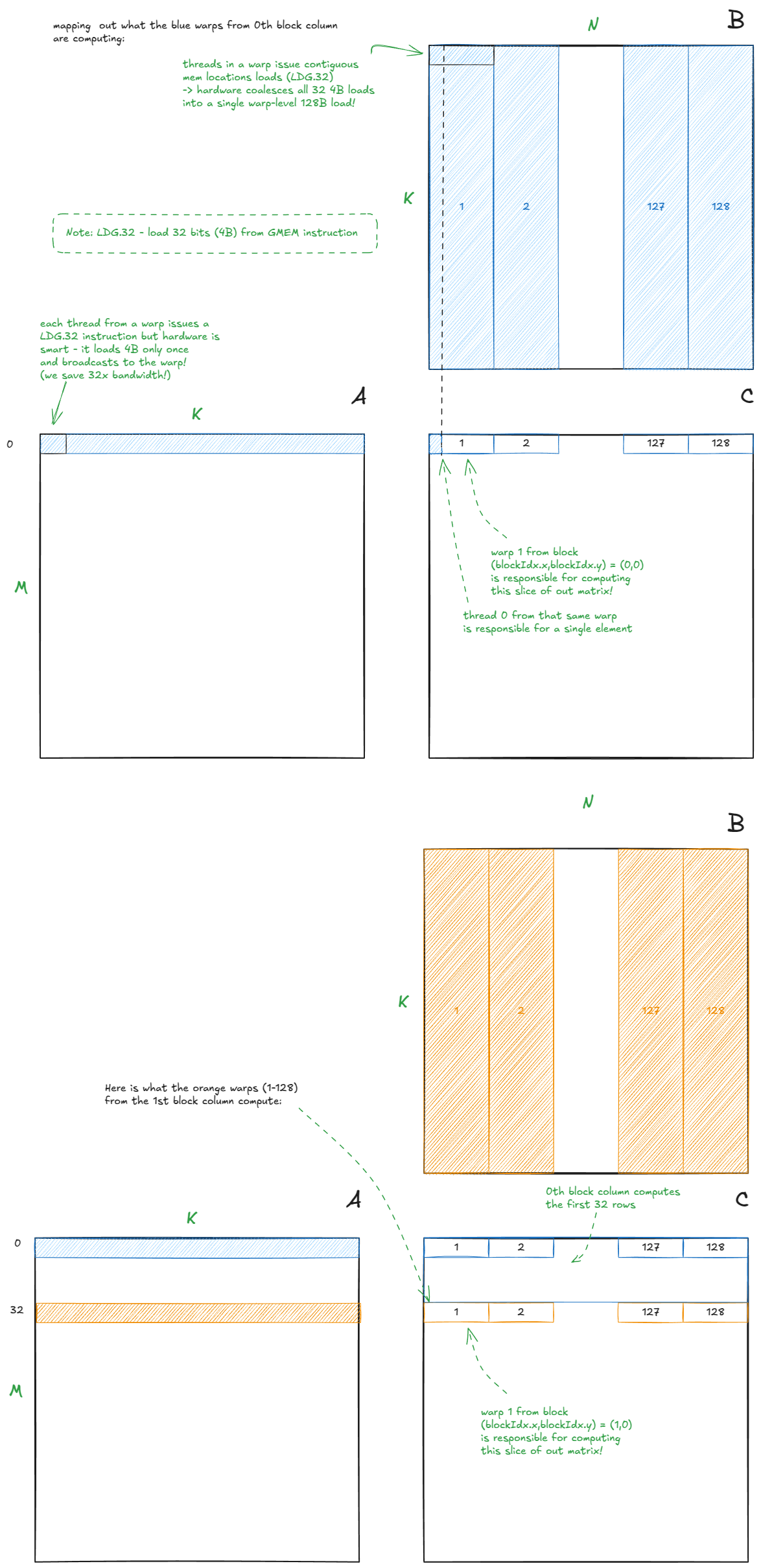 例如,如果threadIdx.x运行范围从 0 到 1023(一个 1D 块,包含 1024 个线程),我们可以将其拆分为 0 到 1023 x = threadIdx.x % 32,从而y = threadIdx.x / 32有效地将该块重塑为 32×32 的逻辑 2D 布局。