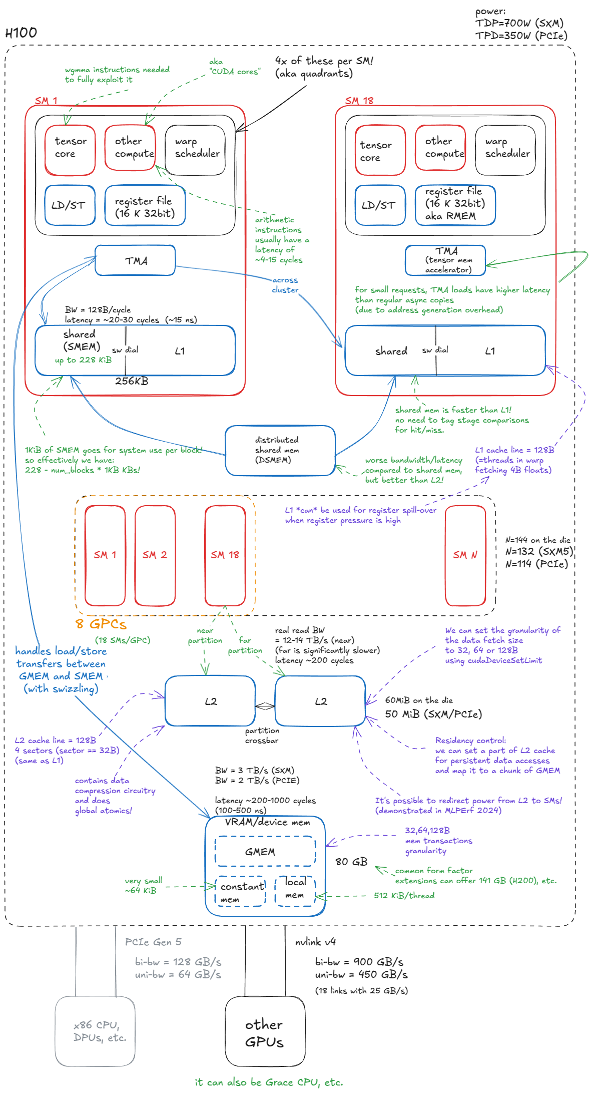 下图所示的 H100 框图反映了这种划分:蓝色组件代表内存或数据移动,而红色组件是计算(热)单元。