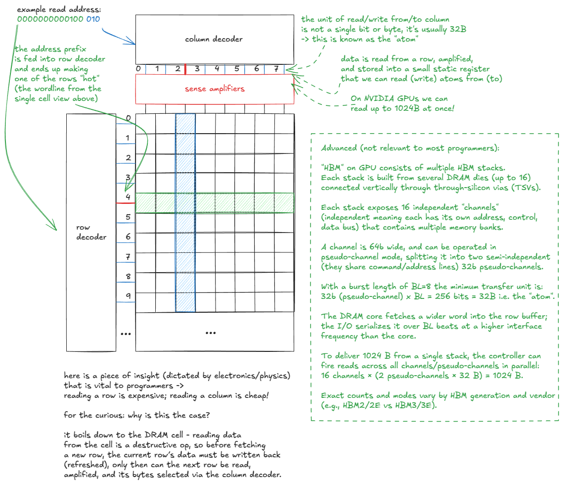 - 设备内存(VRAM)。在 CUDA 术语中,"设备"内存指的是片外 DRAM------它与 GPU 芯片物理分离,但封装在同一块电路板上------采用堆叠式 HBM 实现。它包含全局内存 (GMEM)、每个线程的"局部"内存(寄存器溢出空间)等。