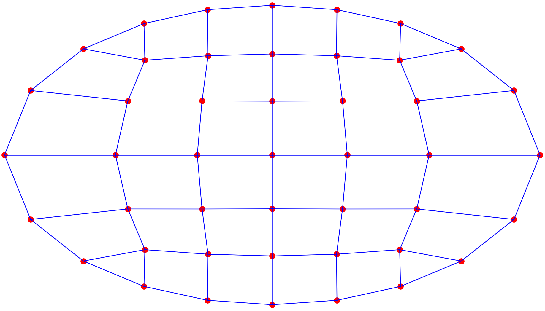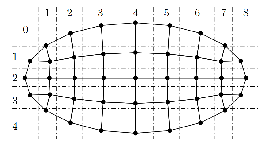 截面外轮廓点进行等距取样后,可对这些点按照一种规则进行标记,方便后续的计算,比如:P[i, j, 0]表示第 i i i行第 j j j列节点的 x x x坐标;P[i, j, 1]表示第 i i i行第 j j j列节点的 y y y坐标。
