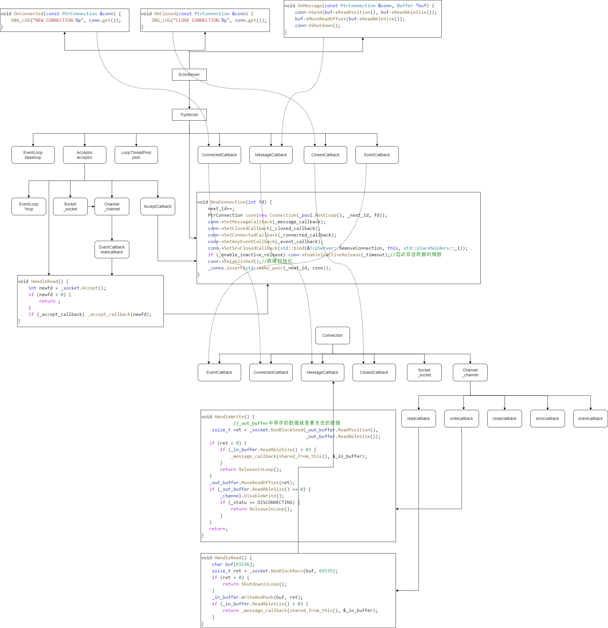 当然,这些回调函数都只是在TcpServer这里暂存,TcpServer应该将这些回调函数传递给每一个新的连接对应的Connection。