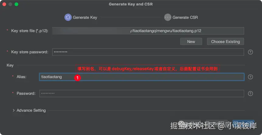 p12创建完成后会回显对应信息,此时还需要设置私钥的Alias(别名),可以按环境设置为 debugKey、releaseKey 也可以自定义为自己好记忆的别名