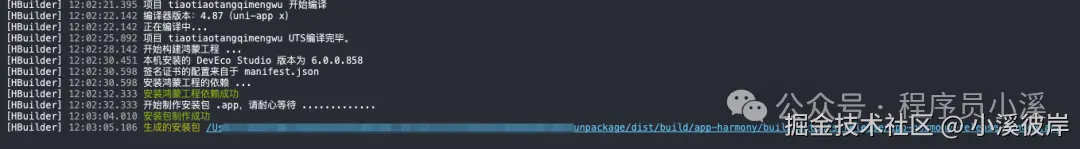 项目开发完成后就可以执行打包了,HBuilder X提供了方便的打包入口,点击【发行】【App-Harmony本地打包】选择【生成安装包】执行打包